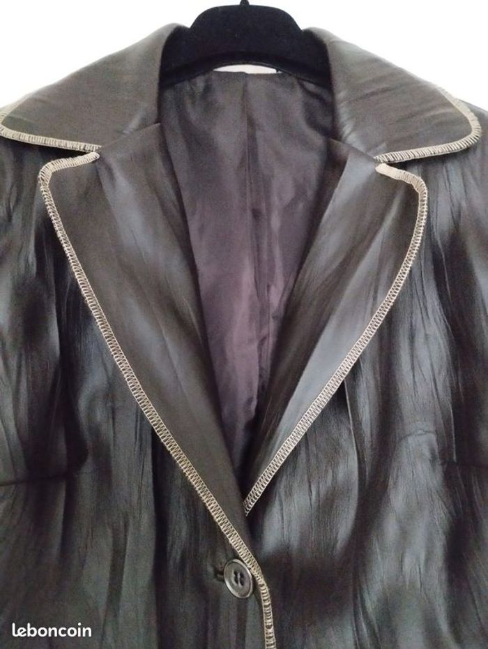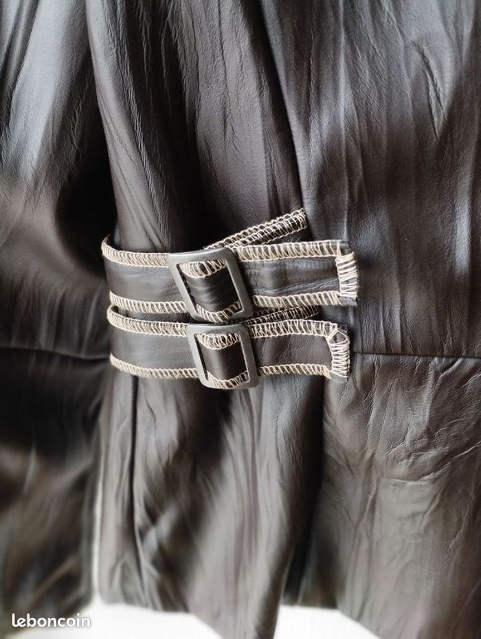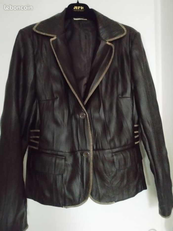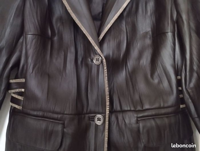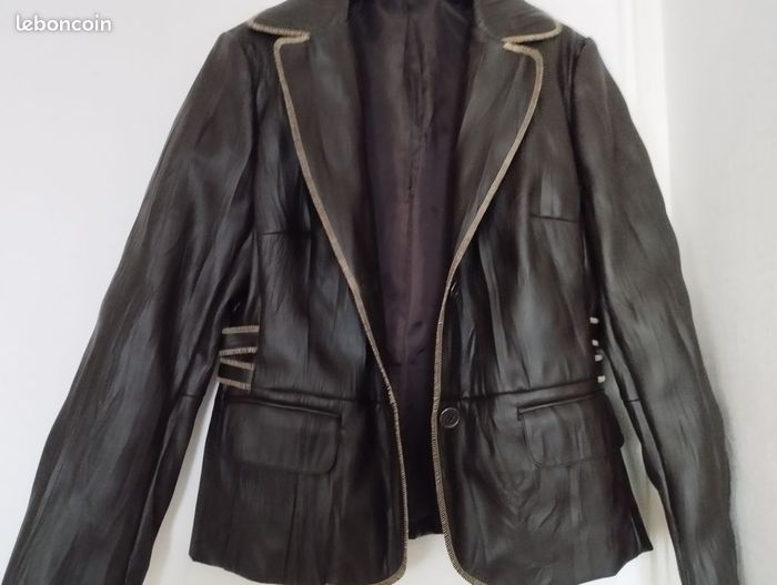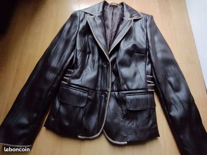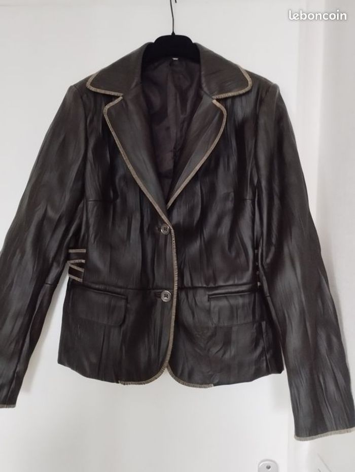 Veste aspect imitation cuir ! Très soupe et confortable ! Facile à l'entretien ! Coloris Marron chocolat ! Doublure intérieur marron. Très belle finition. T 40 voir petit 42. Marque Votre Mode. Très peu portée, comme neuf.