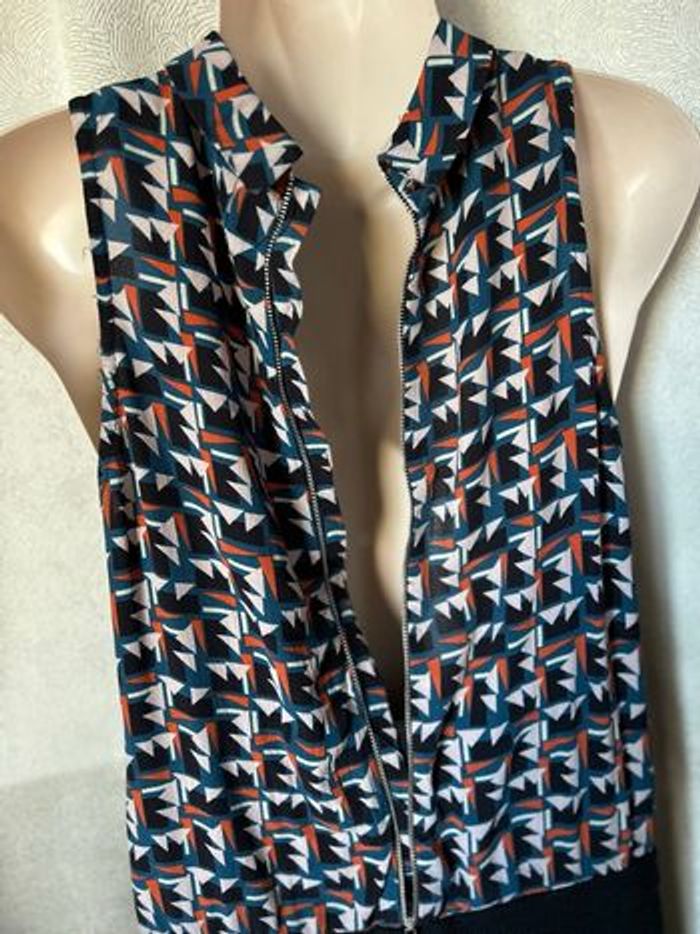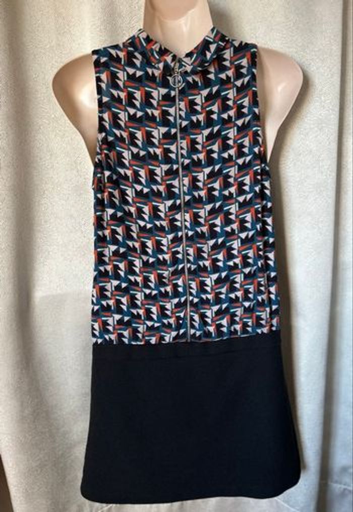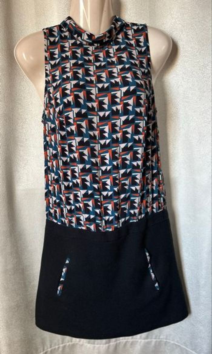 Magnifique robe sans manche style 60/70 Haut imprimé psyché Bas jupe noire avec 2 poches, doublée Taille française 38 Promod Carrure 27 cm Aisselle à aisselle 42,5 cm Longueur 87 cm
