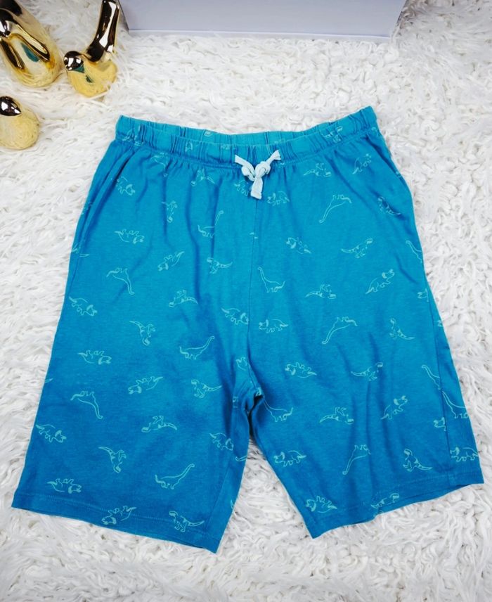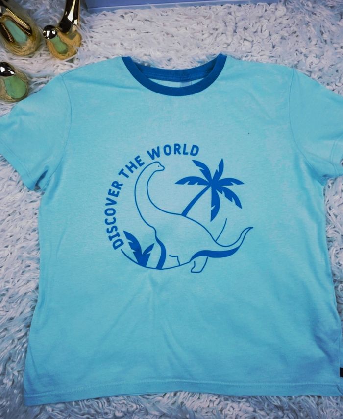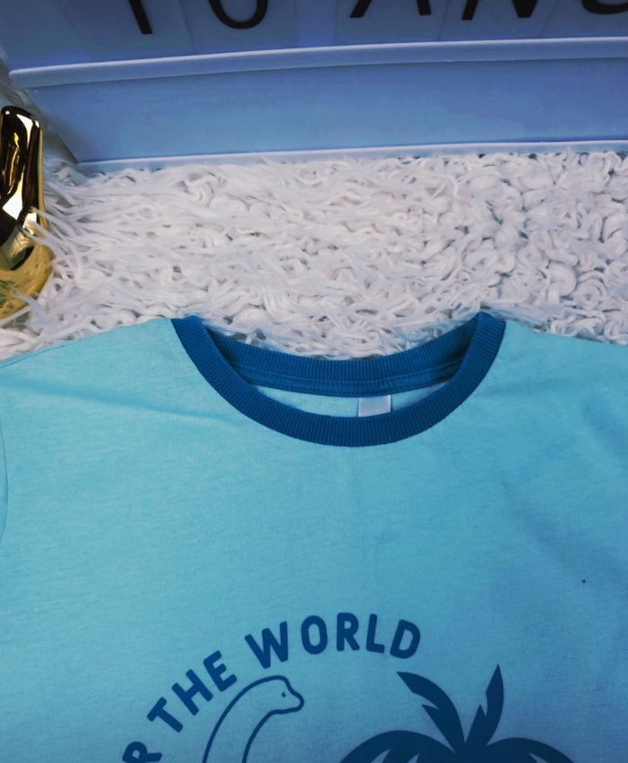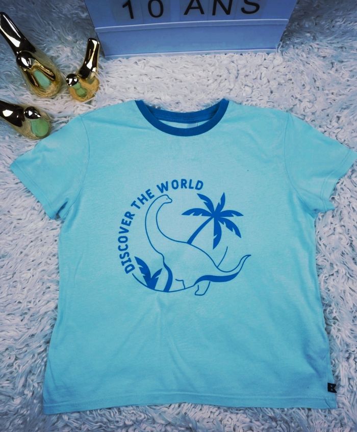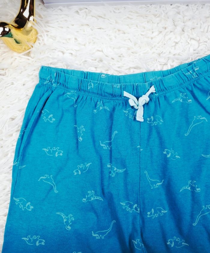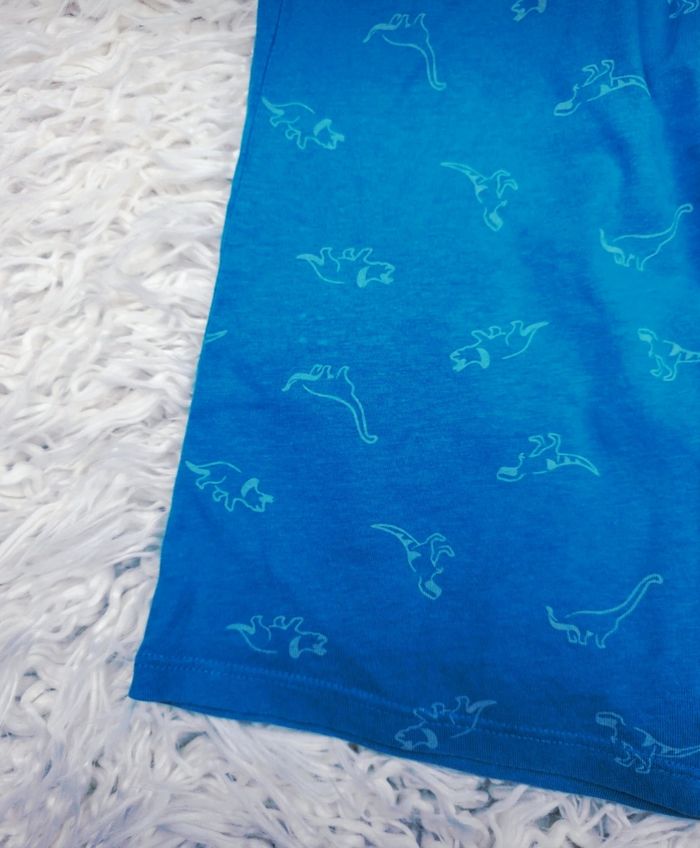 Pyjashort Discover the World bleu garcon taille 10 ans marque Okaidi ✴️ Composition => 100 % coton ✴️ Manches courtes ✴️ Couleur >Un t-shirt bleu ciel arborant une illustration soignée d'un grand diplodocus sous un palmier, avec l'inscription "Discover the world ". Le short taille élastiquée est de couleur bleu orné de différentes silhouettes de dinosaures T-Rex, Tricératops, Stégosaure