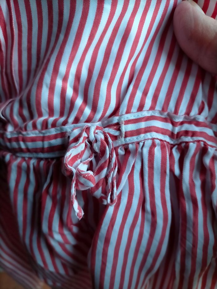 Excellent état. Très jolie robe à manches courtes en soie et coton rayé rouge et blanc. Lien à nouer à la taille, doublure bordée de tartan beige, rouge et noir et zip au dos.