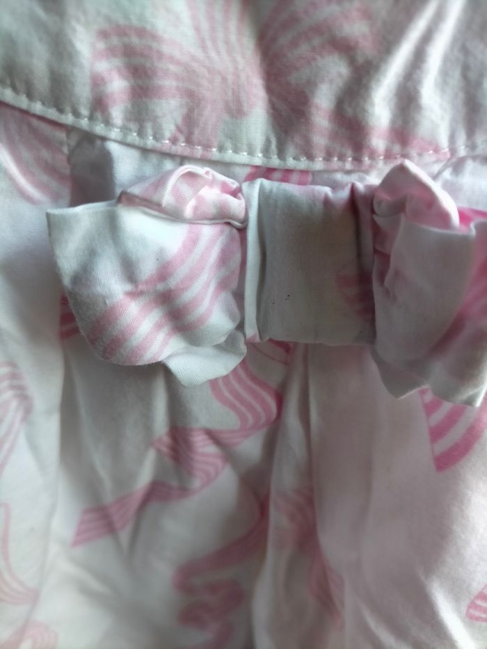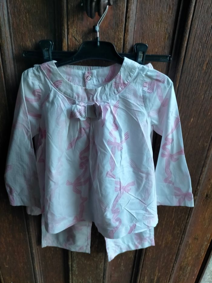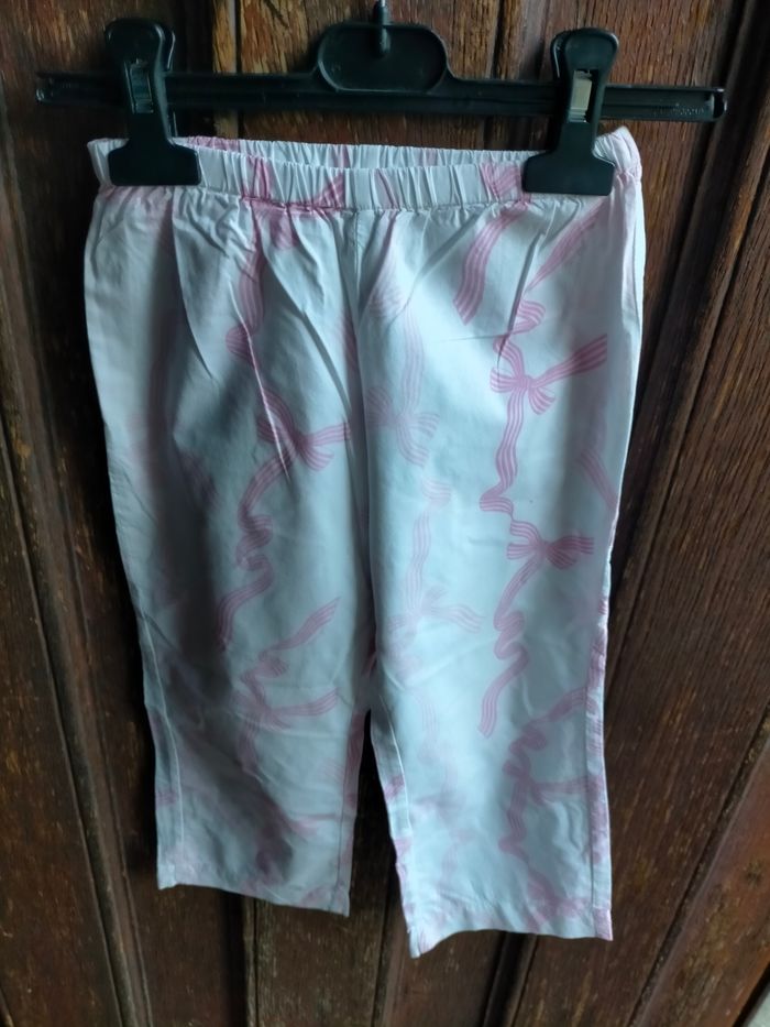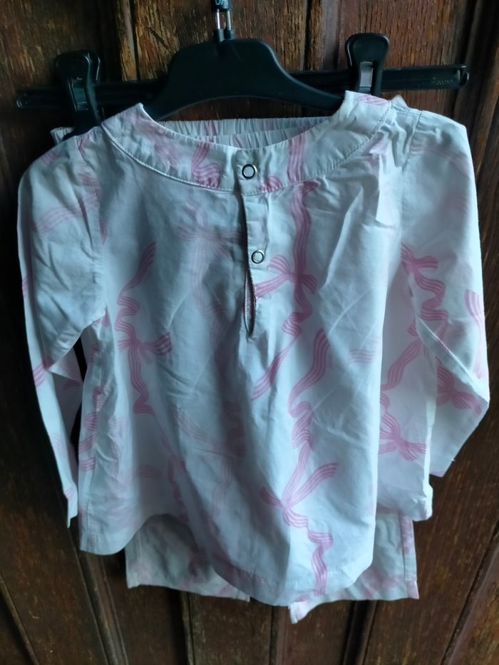 TBE très joli pyjama en cotonnade blanche à motifs de rubans roses, signature Jacadi dans l'imprimé. Haut de coupe évasée avec noeud devant et pressions au dos. Pantalon à taille élastique