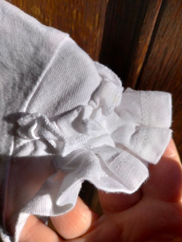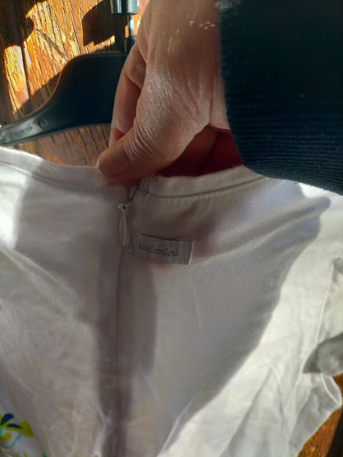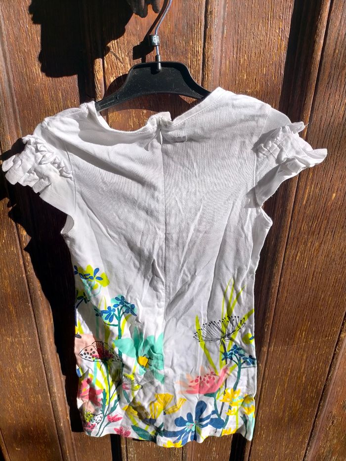 TBE très jolie robe à petites manches avec volants en jersey de coton blanc imprimé fleuri multicolore sur le bas. Étiquette catimini et zip au dos