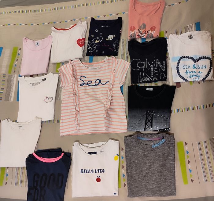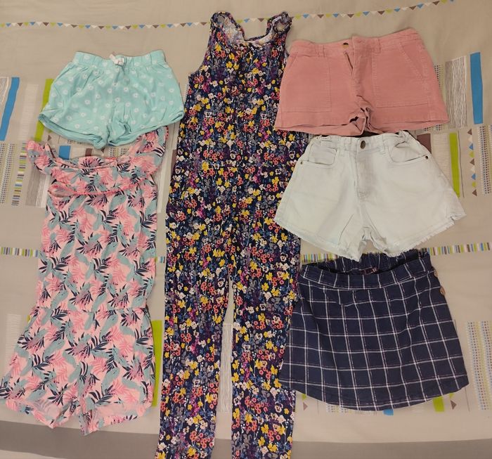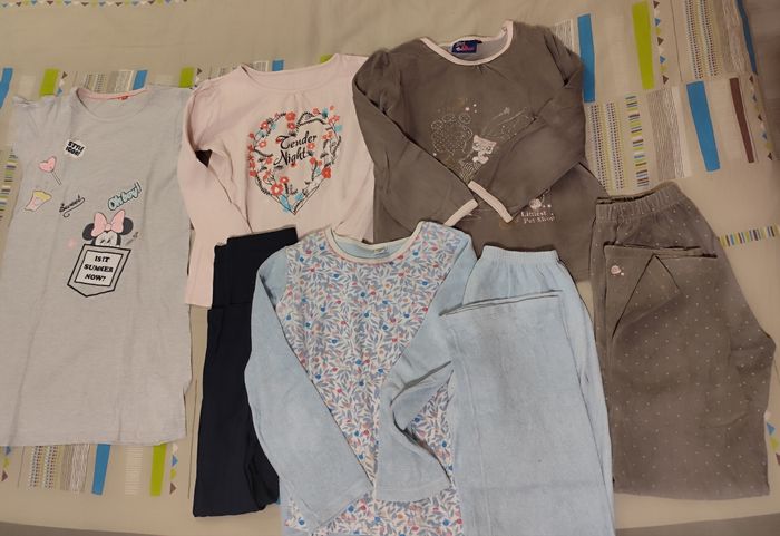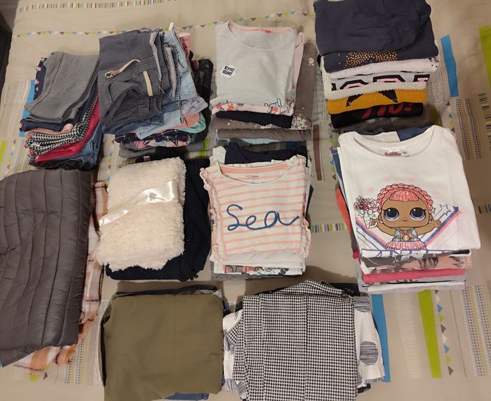 Lot de 79 vêtements. En bon état, pas de trous, pas de bouloches et pas de tâches (sauf quelques unes possible sur certains vêtements blancs). Maison non fumeur. Marques principales : Kiabi, Gémo, okaidi, sergent major, tape a l'oeil et Orchestra. Max. 10 photos donc tous le détail n'est pas là.