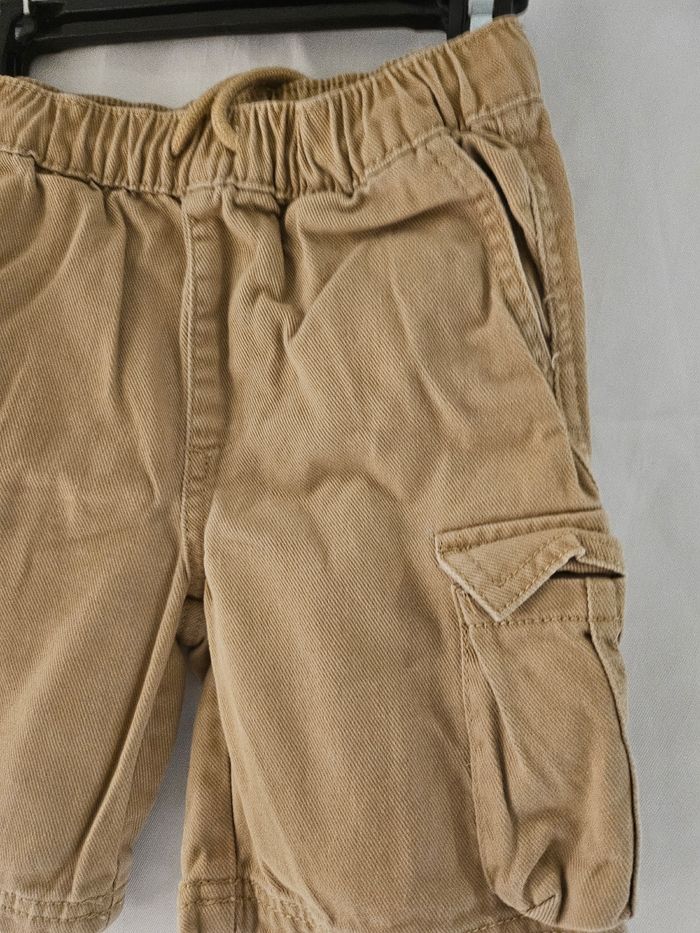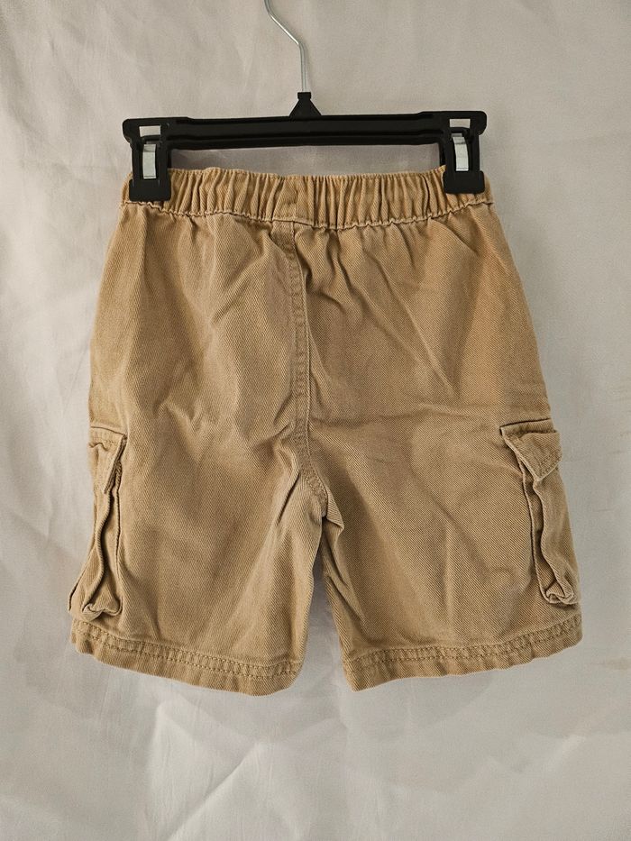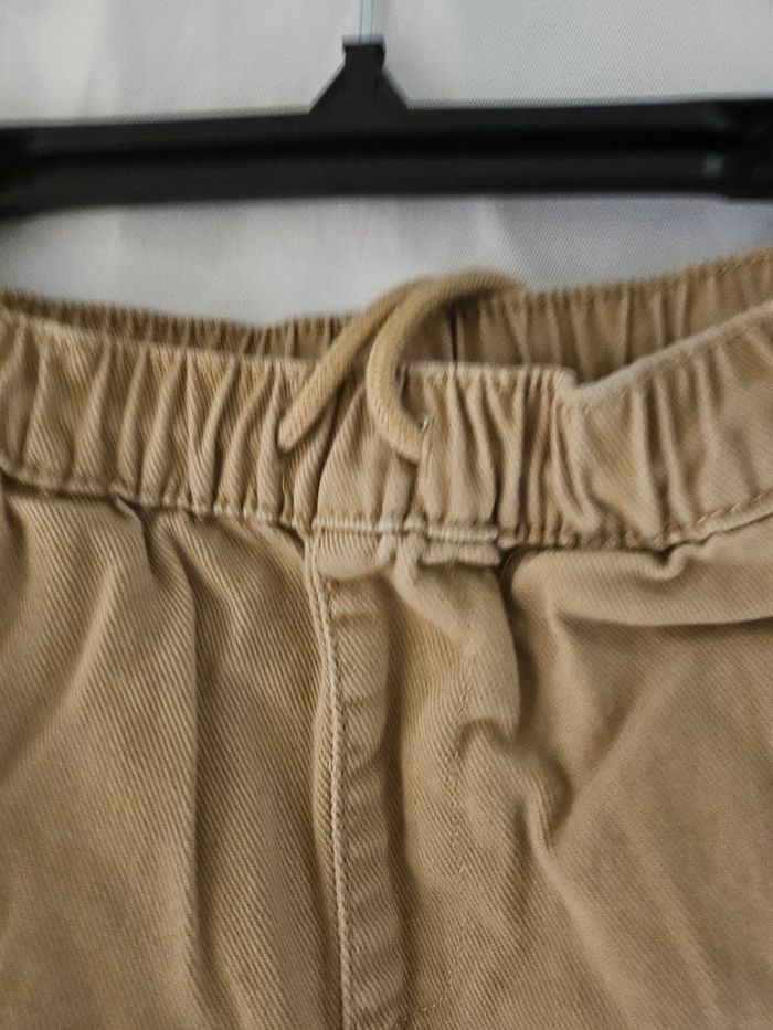 Short marron avec deux poches devant et une de chaque côté. Taille élastique se serre par cordon. Marque : Kiabi Taille : 7 ans