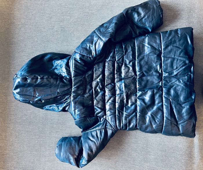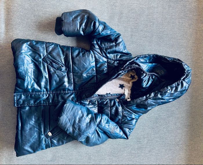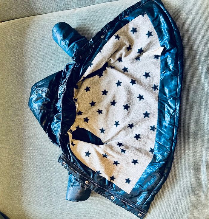 Blouson fille bleu marine intérieur polaire gris et étoiles, flocage dans le dos Taille 12-18 mois Marque IKKS Bon état