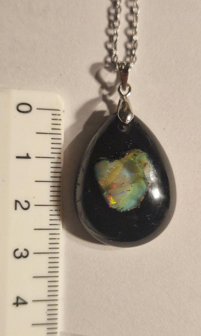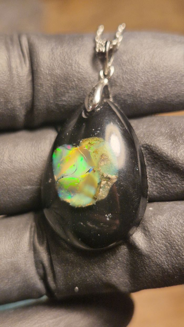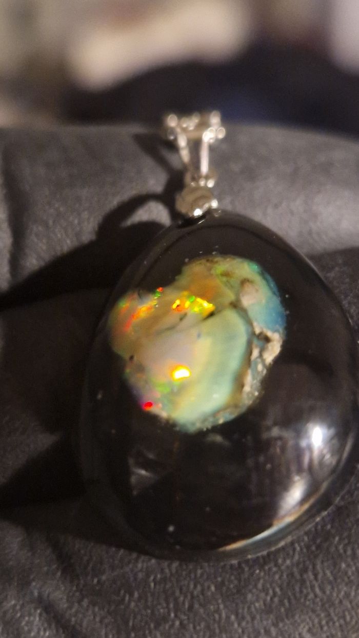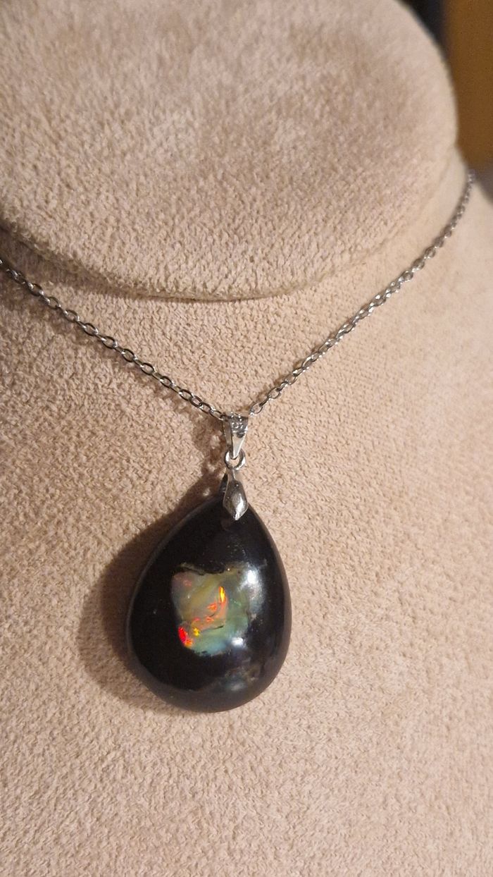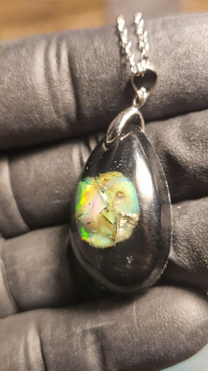 Pendentif résine avec véritable opale éthiopienne brute Jolis reflets Beliere acier Vendu avec chaîne