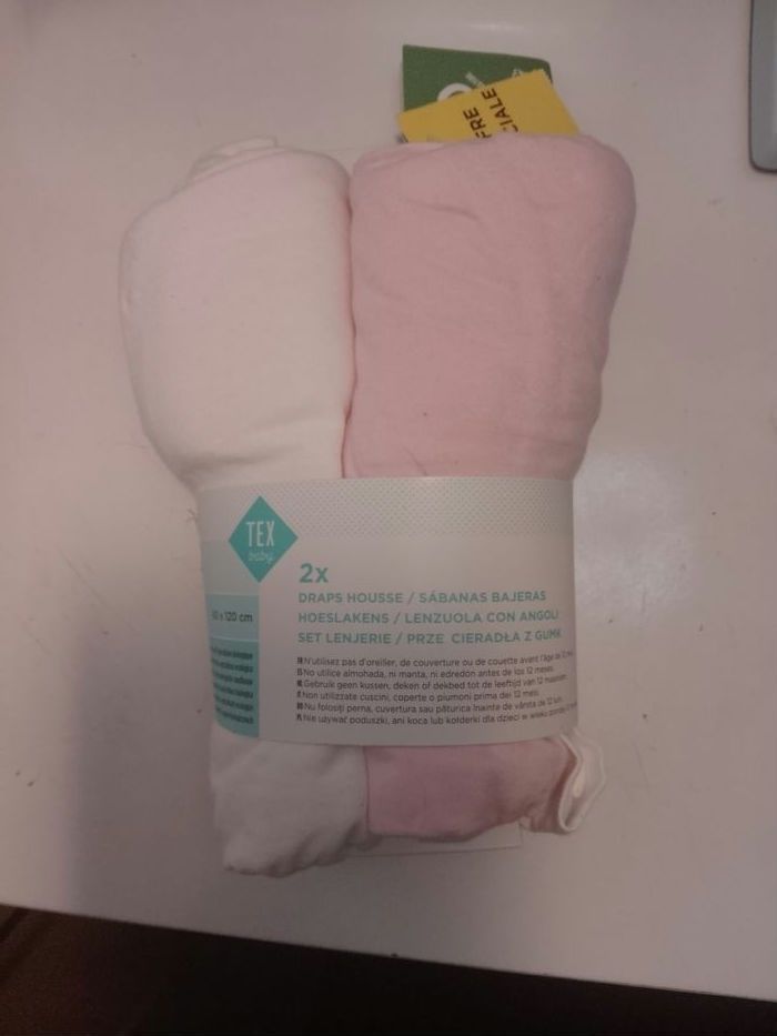 Lot de 2 drap housse lit bébé 120 x 60 Neuf avec étiquettes, éco Tex. Blanc et rose.. acheté a carrefour.