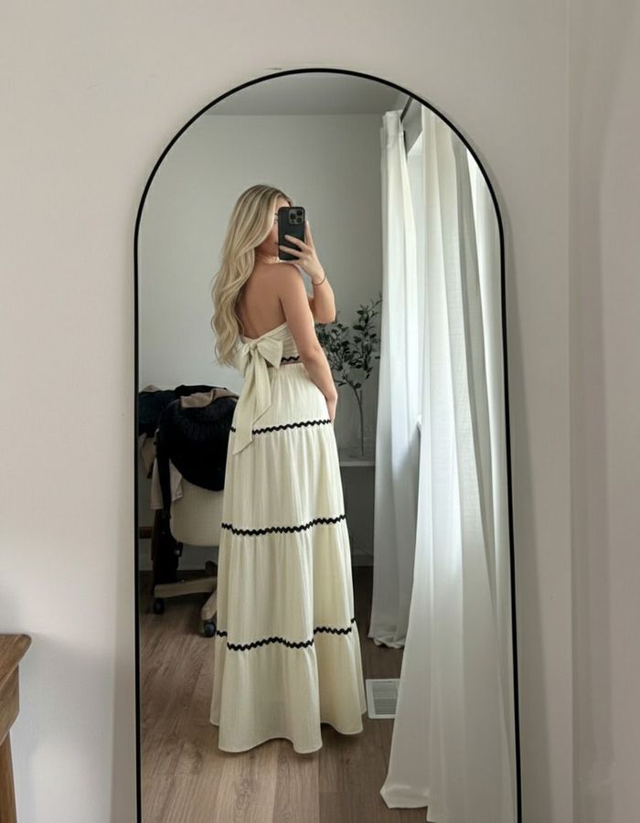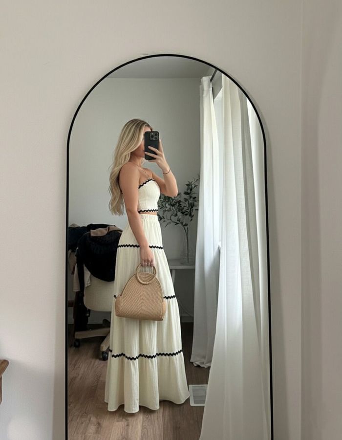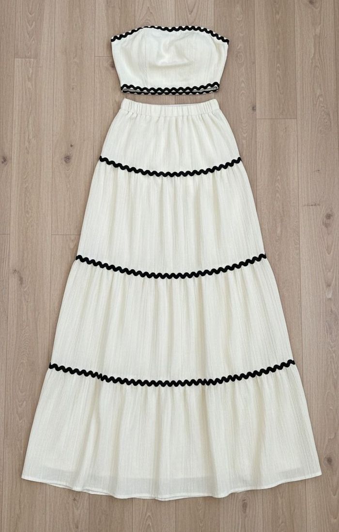 Je vends ce magnifique ensemble coordonné composé d'un top bustier et d'une jupe longue, une tenue solaire et ultra-élégante qui rappelle le style des vacances sur la Côte d'Azur ou en Grèce. Détails de l'ensemble : Le Top : Une coupe bandeau/bustier sans bretelles qui met en valeur le décolleté et les épaules. Le détail fort se trouve à l'arrière avec un superbe nœud à nouer, permettant d'ajuster parfaitement le top à votre tour de poitrine tout en apportant une touche très féminine. La Jupe : Une jupe longue à étages (volants) qui offre un volume magnifique et une allure aérienne. La taille est élastiquée pour un confort absolu tout au long de la journée. Finitions : L'originalité de cet ensemble réside dans ses finitions en "croquet" (liseré ondulé) noir qui soulignent chaque étage de la jupe et les bords du top. Ce contraste graphique noir sur blanc est à la fois moderne et intemporel. Matière : Le tissu présente un aspect légèrement texturé (type lin ou coton mélangé), très frais et agréable sur la peau, idéal pour les températures estivales. État : L'ensemble est dans un état impeccable. Il a été porté une seule fois pour une journée de vacances et a été lavé avec soin. #ensemble2pieces #tenuedete #bohemechic #resortwear #blancetnoir #croquet #jupeevolants #topbandeau #tenuevacances #chic #ensemblefemme #stylegrec ##lookete