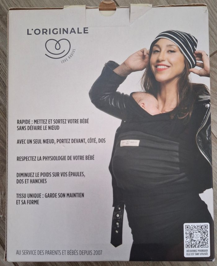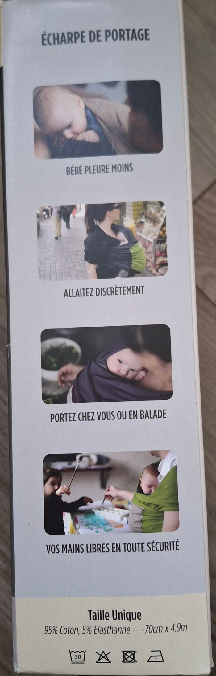 La référence de l’écharpe de portage depuis 2007 0-36 mois | 3,5-14 kg Maintien souple effet seconde peau 1 noeud préalable : mettez et sortez bébé SANS le défaire : pratique pour les couches ! Tissu créé pour le portage : garde son maintien même quand bébé grandit Poche pour ranger couches, tétines… Portez devant, côté et dos Unisexe, taille unique toute morphologie Si vous voulez une écharpe polyvalente et pratique, c'est le bon choix ! 70cm×4.9m Lavable en machine à 30°C, pas de sèche-linge Petit défaut, voir photo,elle est sortie avec ça de la machine à laver. Très peu servie,j'en avais plusieurs. Valeur neuve 75 euros.