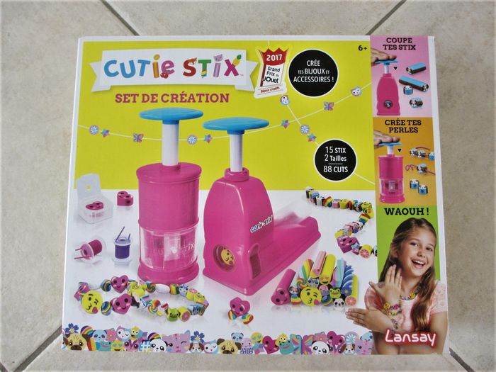 Set de création Cutie Stix - Lansay Dès 6 ans. Pour créer bijoux et accessoires. Contenu :1 atelier de découpe,1 atelier de perçage, 2 moules de découpe, 1 baguette, 6 fermoirs, 1 boîte plastique. Bon état (ne contient pas de stix).