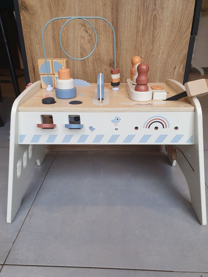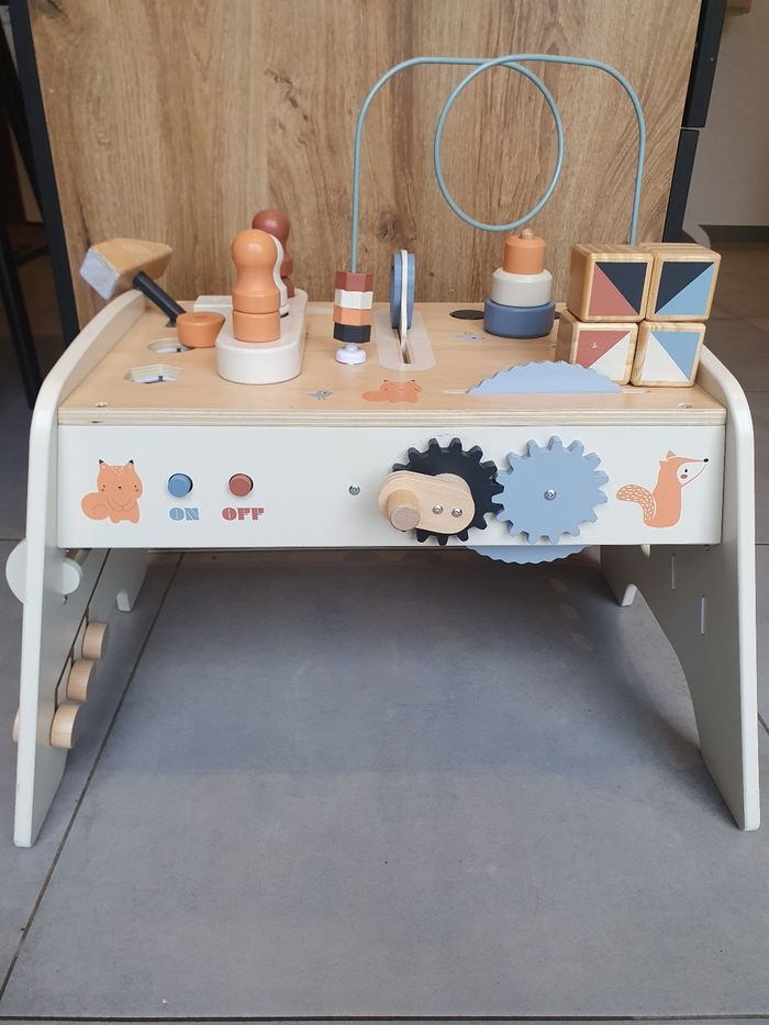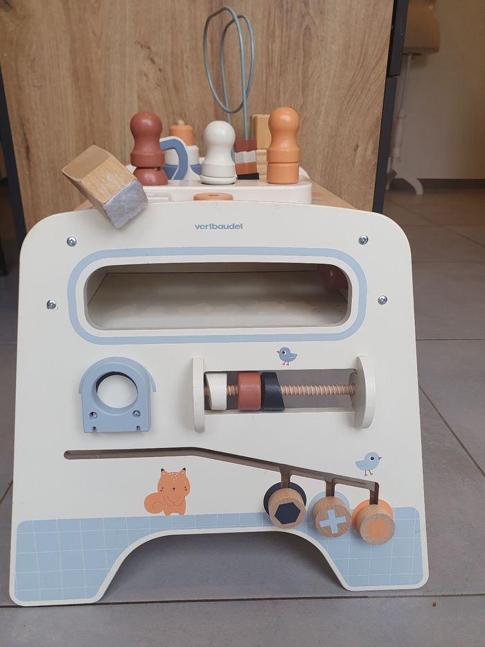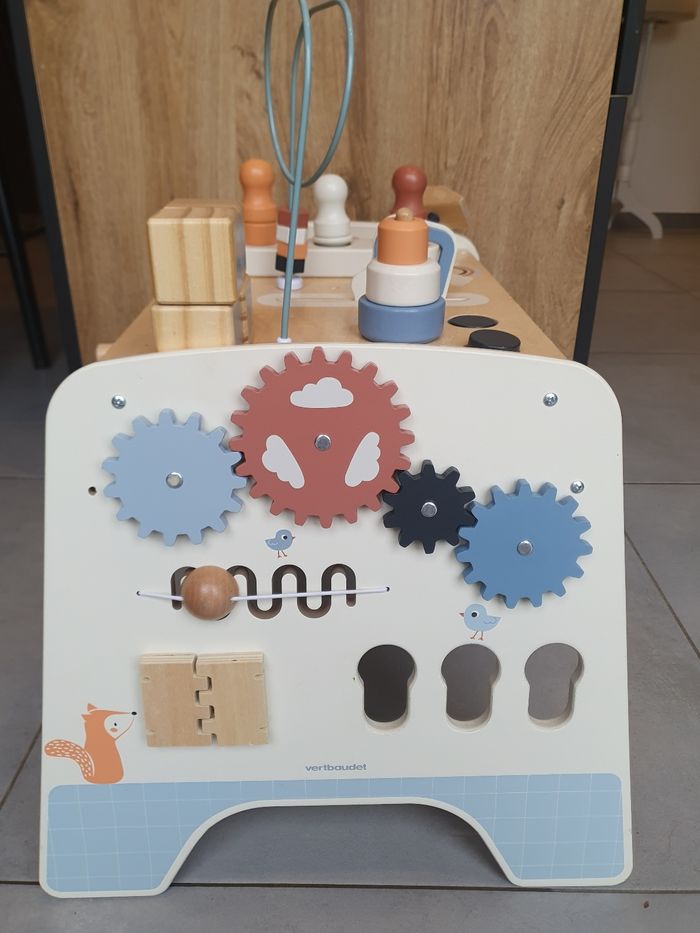 Table d'éveil enfant en bois de lanlarque Verbaudet. En très bon état, il manque juste une pièce pour le jeux des 3 formes