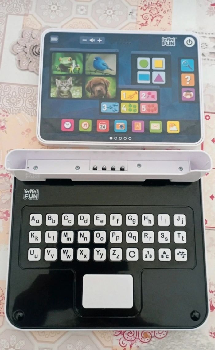 Ordinateur éducatif InfiniFUN. Idéal pour les jeunes enfants : apprentissage des lettres, chiffres, couleurs, formes et animaux. Clavier complet (majuscules/minuscules), activités ludiques et sons éducatifs, on peut utiliser comme tablette et comme ordinateur. Fonctionne parfaitement, très peu utilisé. Quasi neuf .