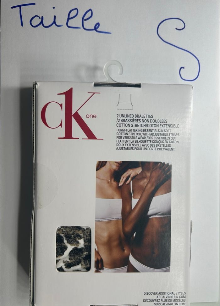 🌸 Lot de 2 brassières Calvin Klein – Taille S 🌸 Je vends plusieurs lots de brassières Calvin Klein (CK One) en taille S. Modèle coton stretch, très confortable, idéal au quotidien 🫶 ✨ Détails : • Marque : Calvin Klein • Modèle : CK One • Taille : S • Type : Brassières non doublées (unlined bralette) • Matière : Coton stretch • État : Neuf (vendu en pack de 2, jamais porté) 🎨 noir et militaire 💰 Prix : • 10€ à l’unité • Possibilité d’achat en lot (me contacter pour le prix du lot) 📦 Envoi rapide et soigné. N’hésitez pas à me contacter si vous avez des questions ou si vous souhaitez choisir un modèle en particulier 😊