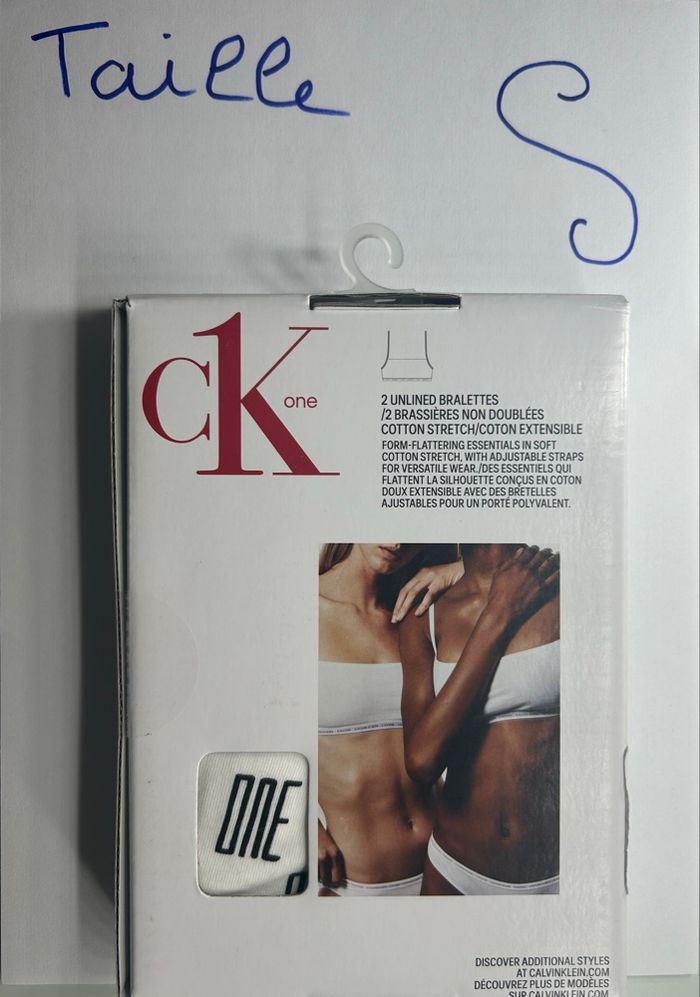 🌸 Lot de 2 brassières Calvin Klein – Taille S 🌸 Je vends plusieurs lots de brassières Calvin Klein (CK One) en taille S. Modèle coton stretch, très confortable, idéal au quotidien 🫶 ✨ Détails : • Marque : Calvin Klein • Modèle : CK One • Taille : S • Type : Brassières non doublées (unlined bralette) • Matière : Coton stretch • État : Neuf (vendu en pack de 2, jamais porté) 🎨 jaune et blanc 💰 Prix : • 10€ à l’unité • Possibilité d’achat en lot (me contacter pour le prix du lot) 📦 Envoi rapide et soigné. N’hésitez pas à me contacter si vous avez des questions ou si vous souhaitez choisir un modèle en particulier 😊