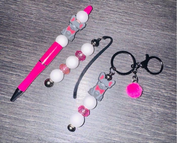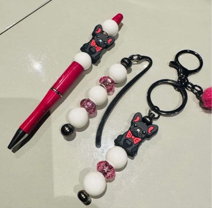 Lot accessoires theme bouledogue comportant : - 1 stylo - 1 marque page - 1 porte clé Neuf jamais utilisé Idée cadeau 🎁