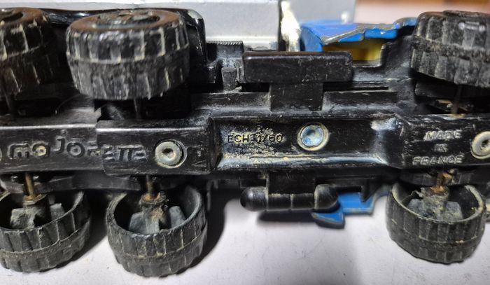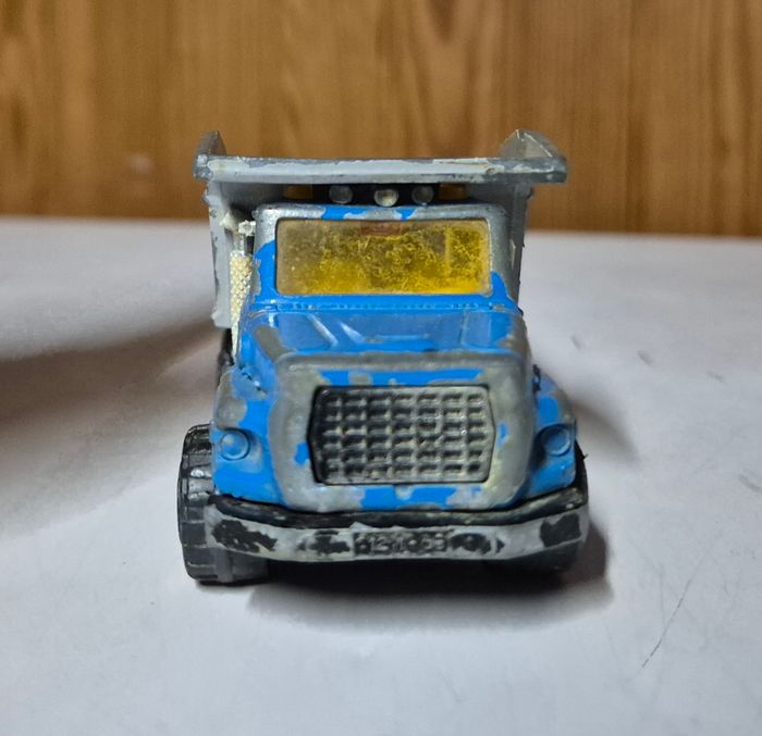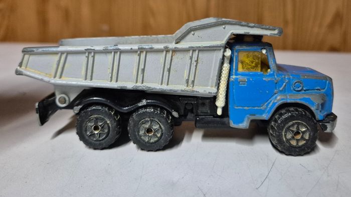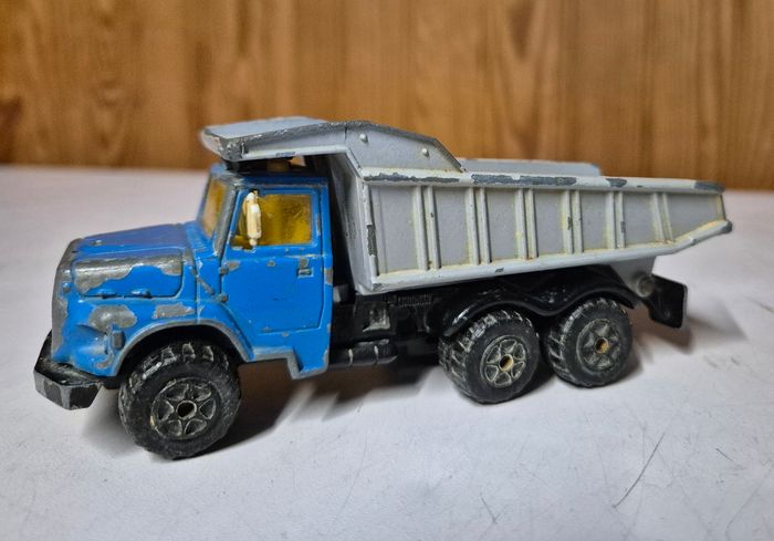 Camion benne Majorette, échelle 1/60, fabrication Made in France. Cabine bleue avec vitrage jaune, benne grise basculante et châssis métal. Modèle vintage avec 6 roues et plaque arrière moulée. Traces d’usage visibles : peinture usée, micro‑rayures et marques du temps, mais fonctionnement de la benne OK. Idéal pour collection, restauration ou diorama construction. Vendu tel que visible sur les photos. #majorette #madeinfrance #camionbenne #majorettevintage #diecast #voitureminiature #constructiontoy #collectionminiature #camionmajorette #camionmajoretteancien