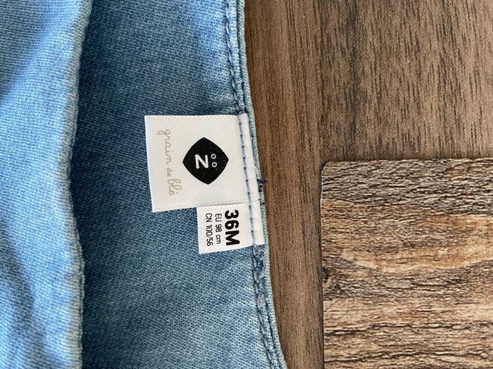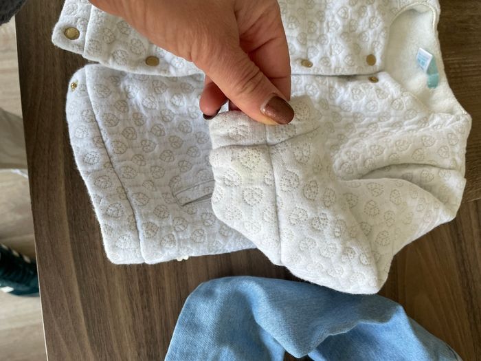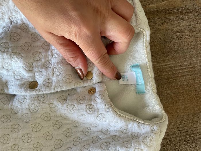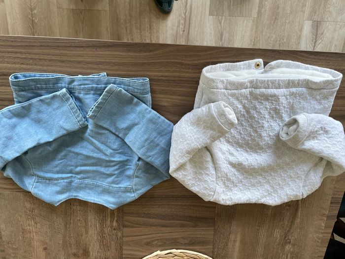 Lot de 2 vestes, 1 obaibi 36 mois blanche à motifs dorés doublée sherpa et une façon perfecto en jean léger. Très bon état, seules deux auréoles jaunes au niveau des poignets de la veste obaibi (dernière photo)