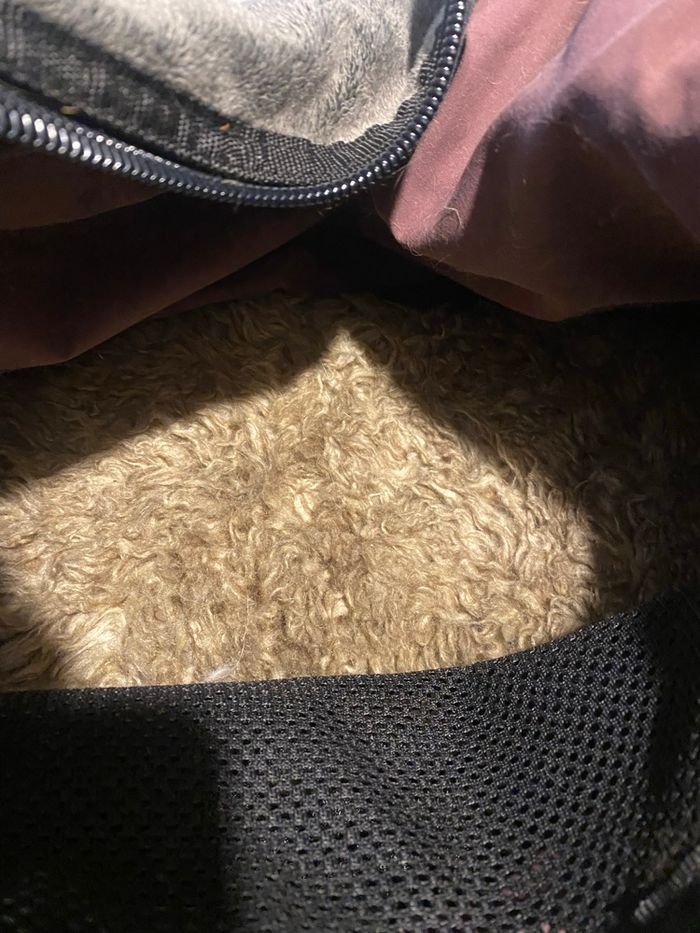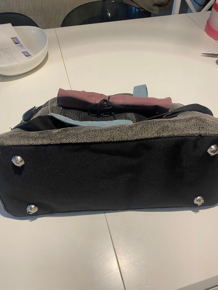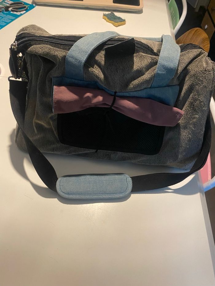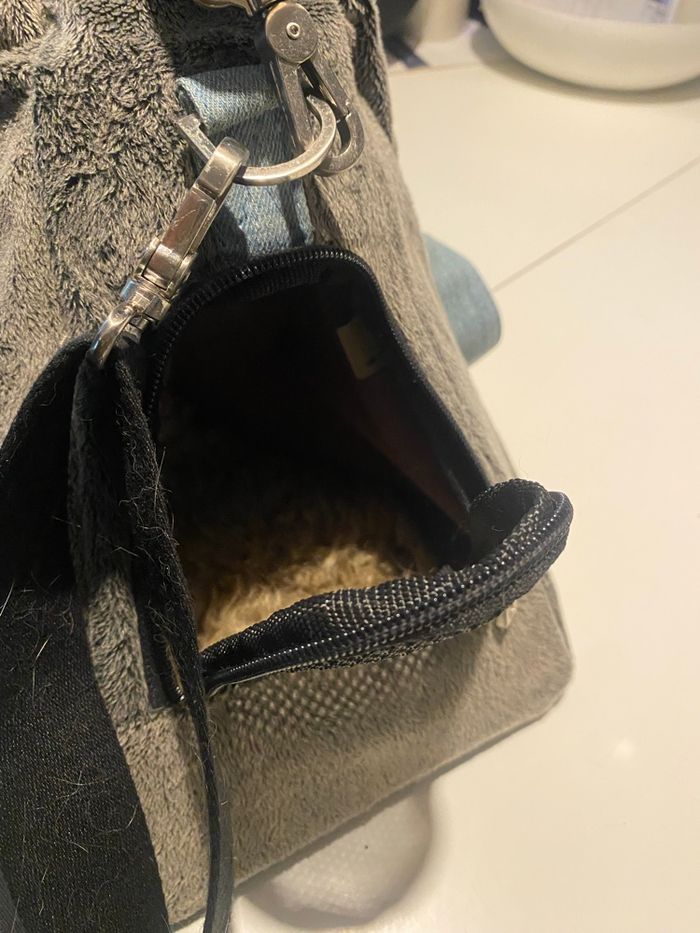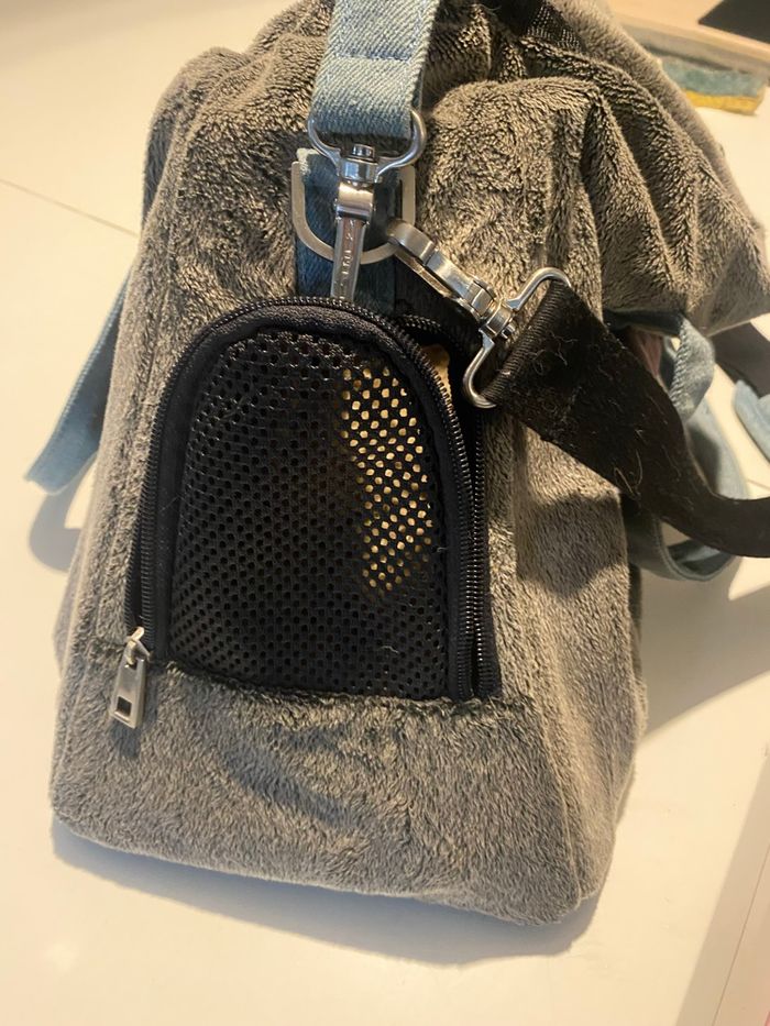 Vends sac de transport pour animaux de la marque Zulu. Un modèle haut de gamme, très robuste et ultra confortable avec son revêtement gris effet polaire et ses détails en jean. Dimensions : env. L 50 cm x l 22 cm x H 32 cm. Je pense que ça doit correspondre à une taille S Caractéristiques : • Confort : Matière "moumoute" très douce, idéale pour apaiser l'animal durant le voyage. • Praticité : Porté main ou épaule (bandoulière réglable incluse). Nombreuses aérations en filet. • Sécurité : Mousqueton intérieur pour attacher l'animal. • Protection : Pieds métalliques sous le sac pour éviter le contact direct avec le sol. À noter : Le sac est en très bon état structurel, mais il mériterait un petit coup de nettoyage/brossage car il reste quelques poils à l'intérieur et sur le tissu (visible sur les photos).