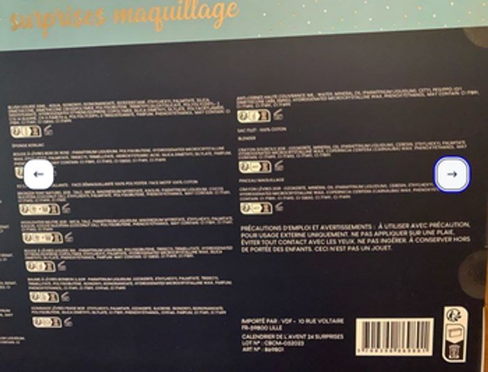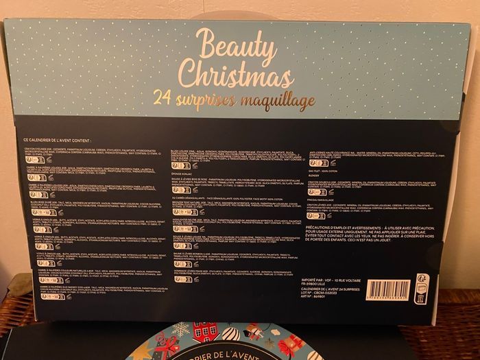 “ Calendrier de l’Avent avec ses 24 articles. * Neuf, jamais ouvert encore scellé. * 24 articles de Beauté et soins. * Taille : 50 cm x 37 cm x 5 cm. * J' ai 2 disponibles…9.99€ ou 7,99€. L'un avec une petite déchirure sur le côté de l'emballage. Il pourrait facilement être scotché (voir dernière photo). Ce coffret est vendu à seulement 7.99. - 2 Options de livraison : Mondial Relais ou shop2shop. Ou récupérer à 79160 Coulonges sur l'autize.