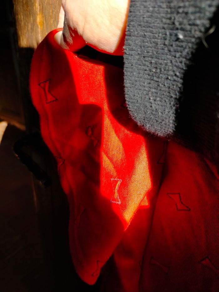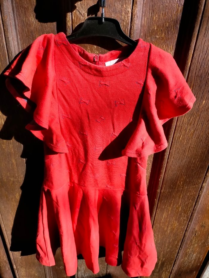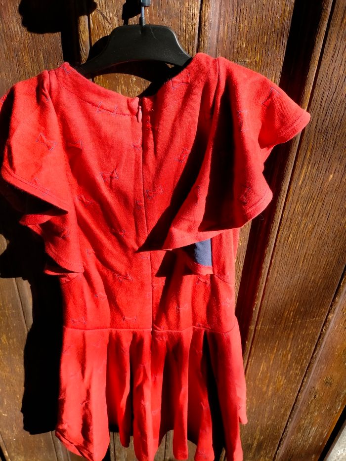 Parfait état. Très jolie robe avec grands volants aux emmanchures en jersey rouge imprimé de noeuds. Zip au dos