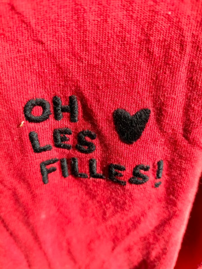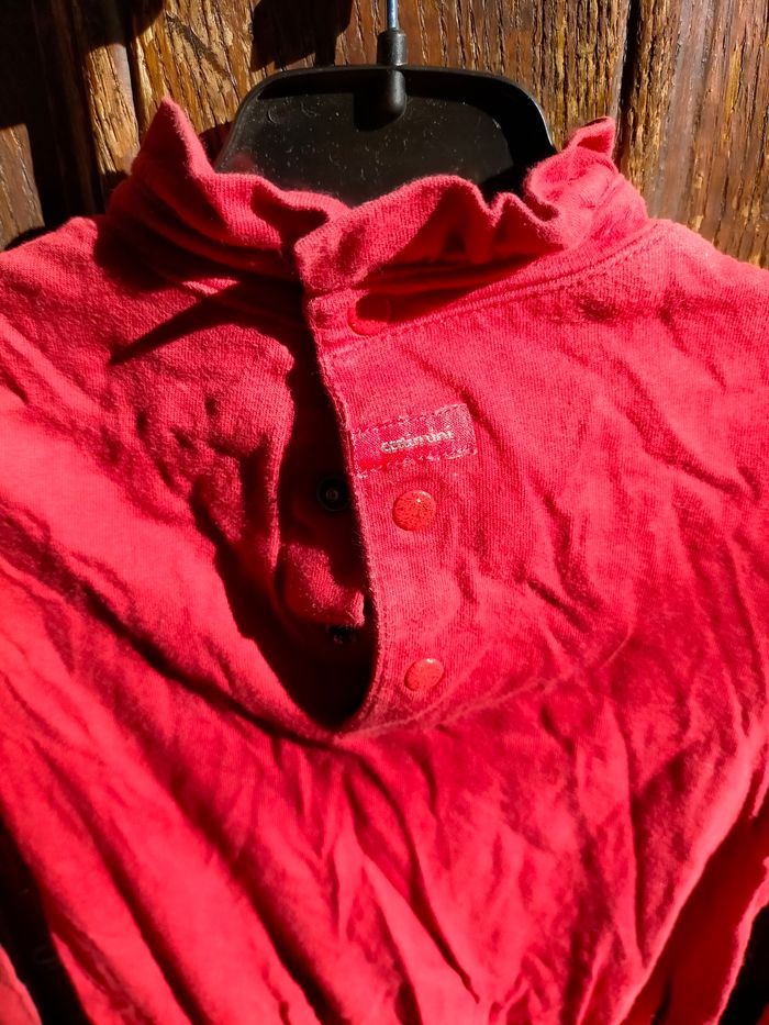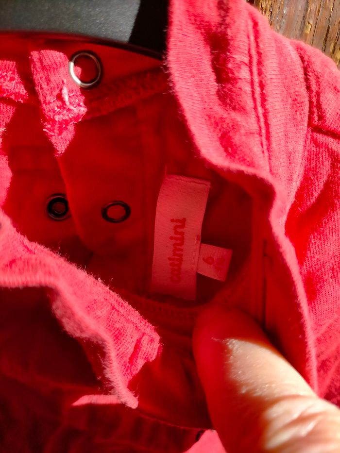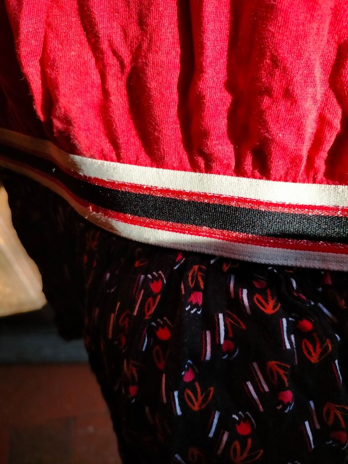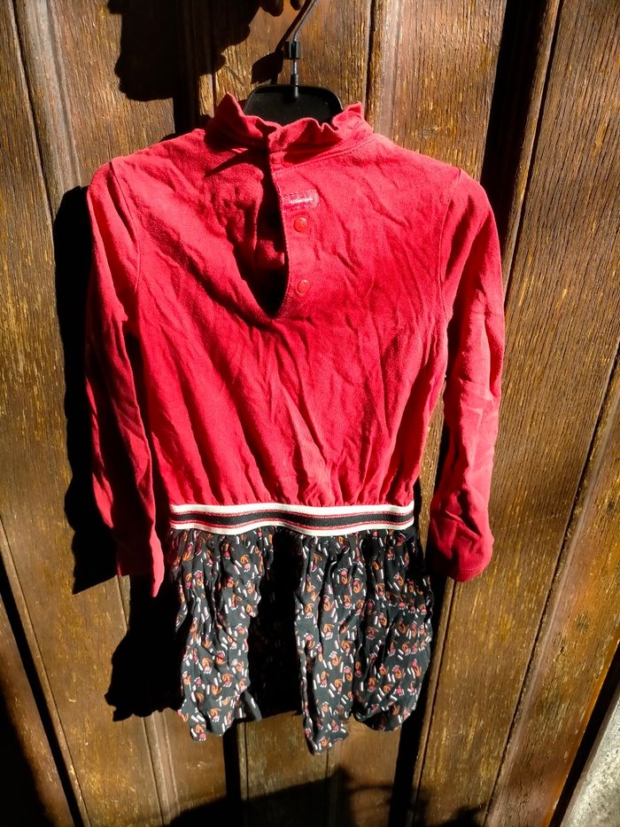 BE porté mais pas de défaut. Très belle robe à manches longues. Haut avec col volant en jersey de coton rouge, broderie ho les filles, pressions et étiquette catimini au dos. Taille élastique rayée avec lurex et base en cotonnade noire imprimé