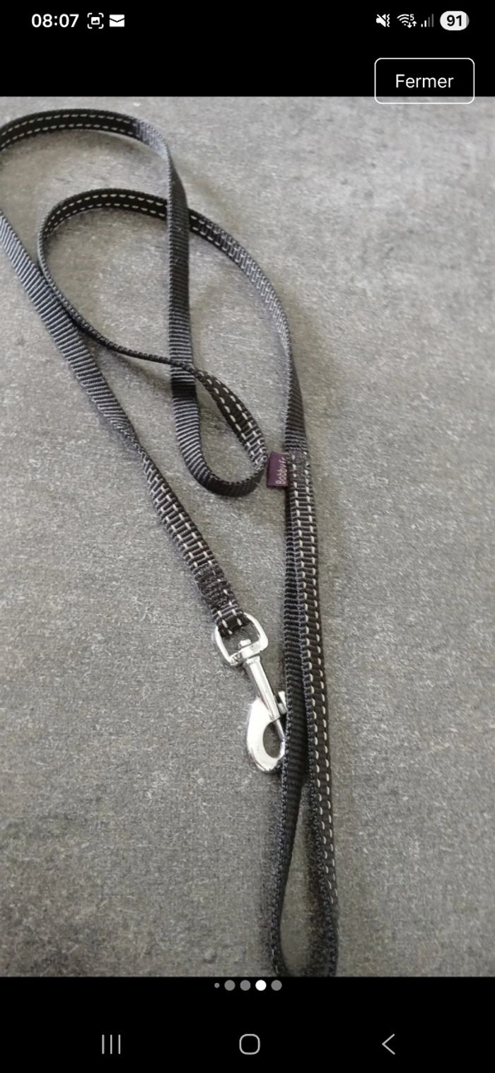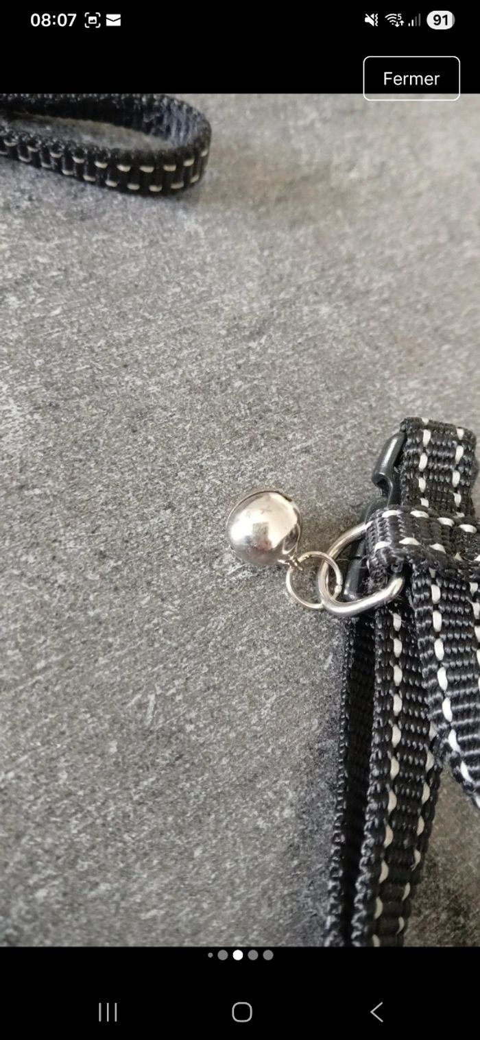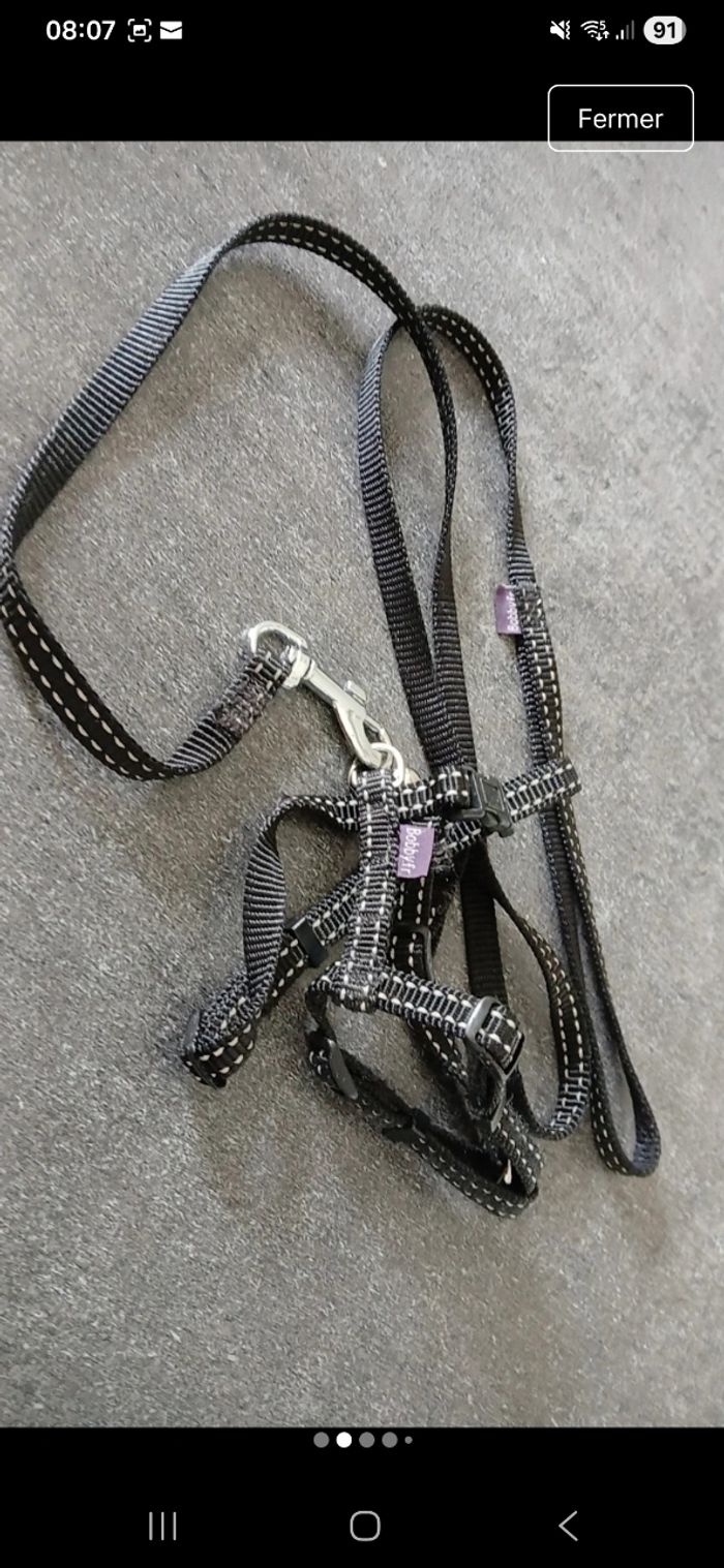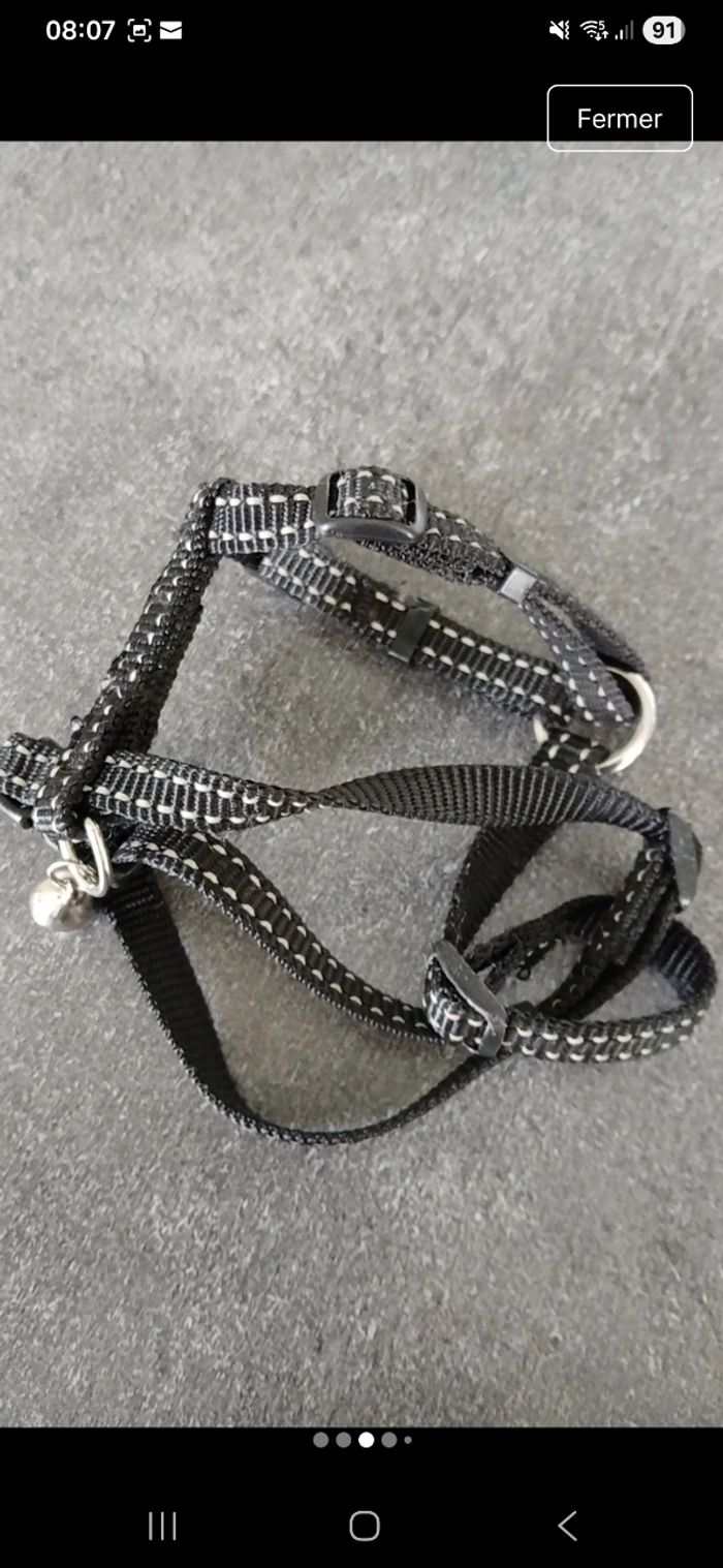Lot comprenant un harnais pour chat ou chien de petite taille, avec laise qui va avec. Clochette présente sur le harnais. Mousqueton pour accrocher la laise. Harnais réglables en 6 points. De marque Bobby.fr