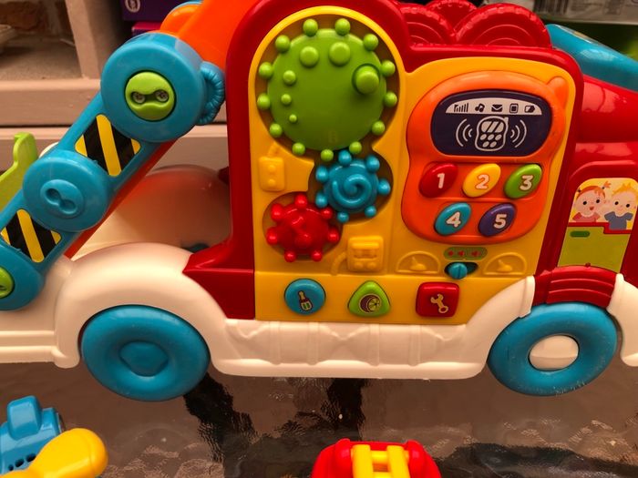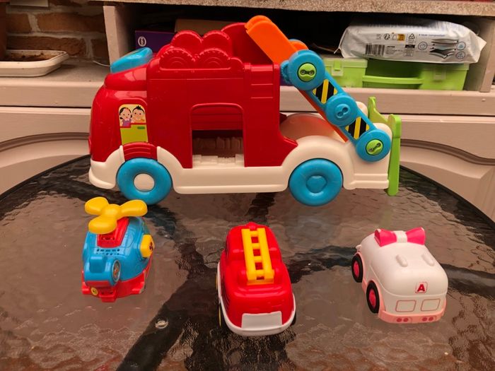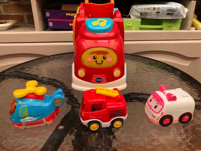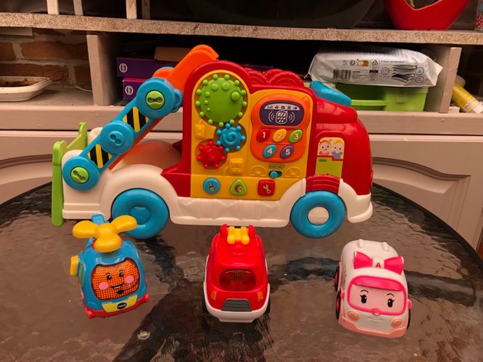 Lot VTech tut tut bolides Le camion de remorquage in interactif Un grand véhicule avec rampe de chargement. Engrenages à manipuler et téléphone pour apprendre les chiffres . Léo le p’tit hélico: un hélicoptère interactif qui parle est chant Un camion de pompiers qui fait du bruit Est ambre l’ambulance Le tout fonctionne reste ma maitre les piles