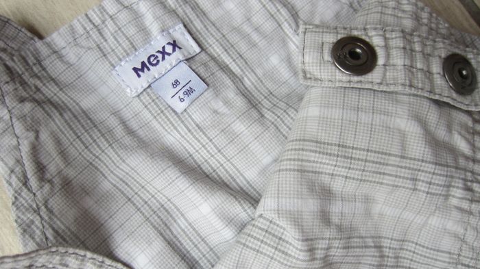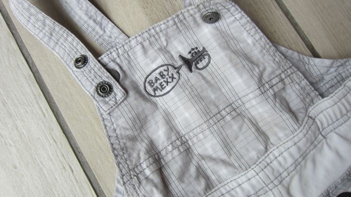Salopette de coloris gris/blanc. 2 emplacements pour les pressions des bretelles. Taille 6/9 mois (68 cm). Marque : Mexx.
