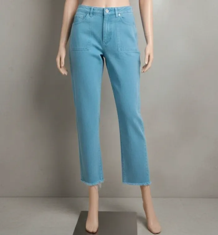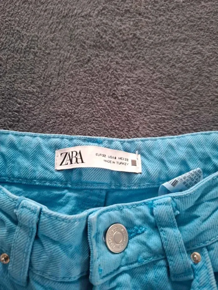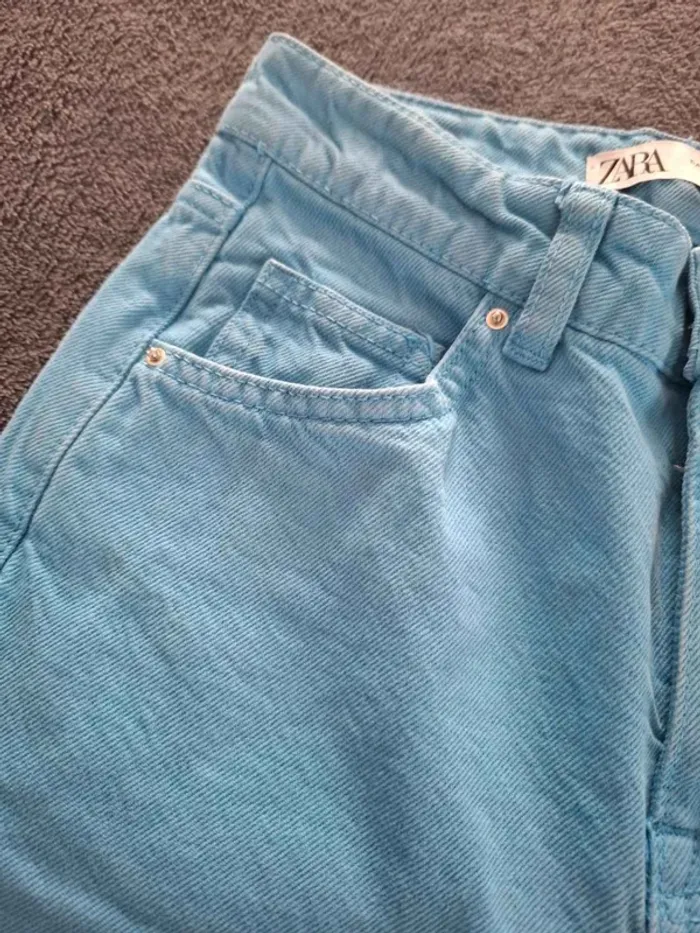 superbe jean Zara d'une couleur bleu turquoise / azur très vibrante, idéal pour la saison ! ​Coupe : Coupe droite avec finition bas effiloché (franges) pour un look tendance. ​Taille : 32 EUR / 0 USA (correspond à un XXS). ​État : Très bon état, couleur bien préservée. ​Marque : Zara Denim Collection. Envoie rapide et soigné 📨