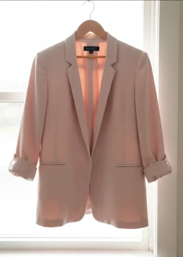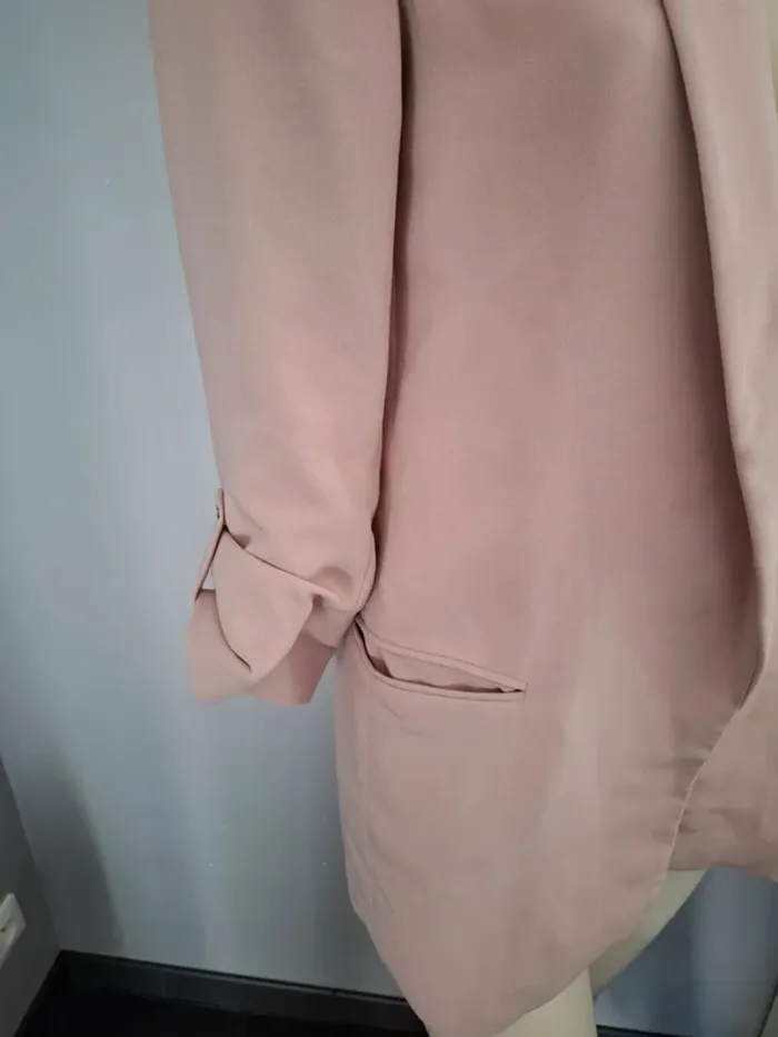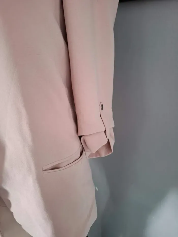 Marque : Zara Basic Collection ​Taille : XS (convient aussi à un petit S car coupe fluide) ​Couleur : Rose poudré / Nude ​Détails : * Manches 3/4 froncées/retroussées d'origine. ​Poches passepoilées sur le devant. ​Coupe ouverte (sans boutons). ​Entièrement doublé à l'intérieur. ​État : Très bon état.