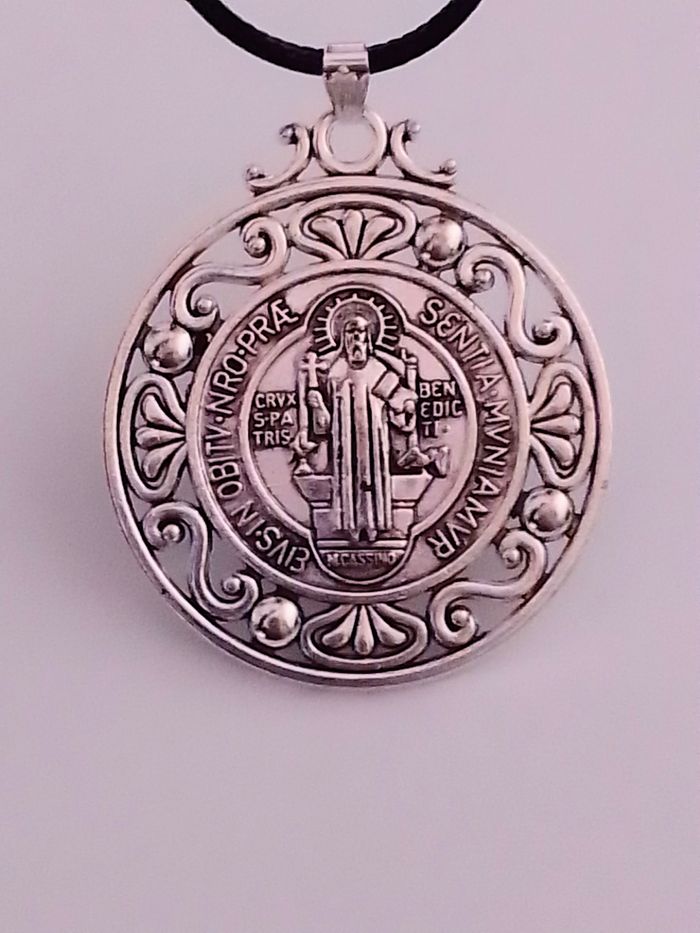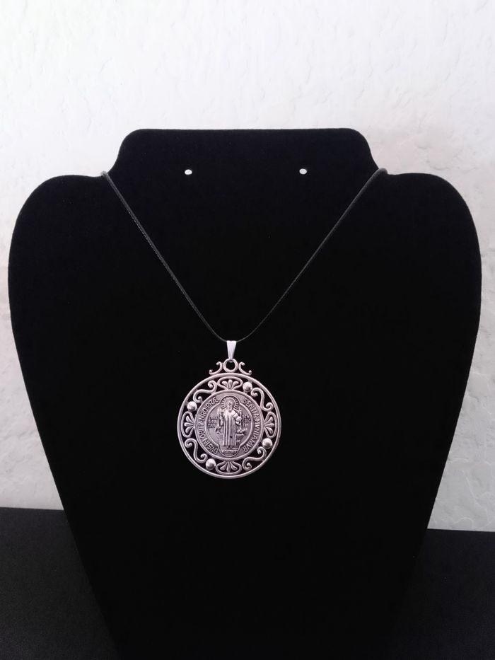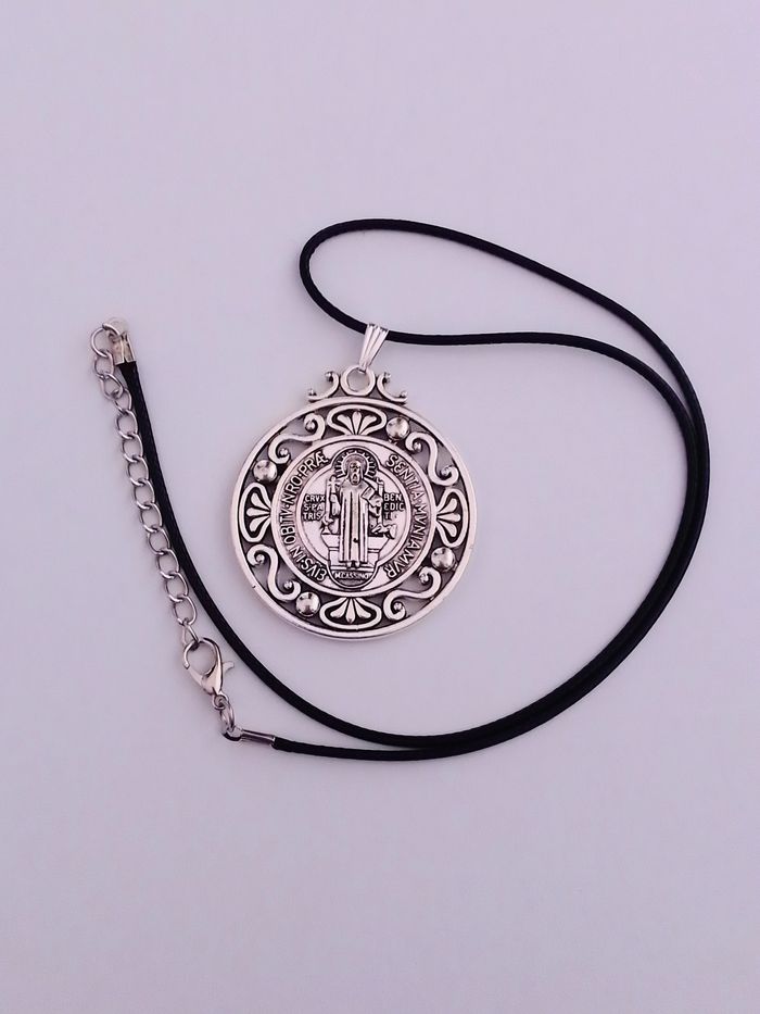 Collier corde de cire + pendentif religieux. Pendentif : médaille, motif : saint benoît, croix. (religieux, spirituel, protection, celtique, idéal cadeau) DESCRIPTIF : Pendentif double face. Couleur : argenté. Taille chaîne : 45 cm + 5 cm Diamètre pendentif : 4 cm L * 4,7 cm H Envoi rapide et soigné.
