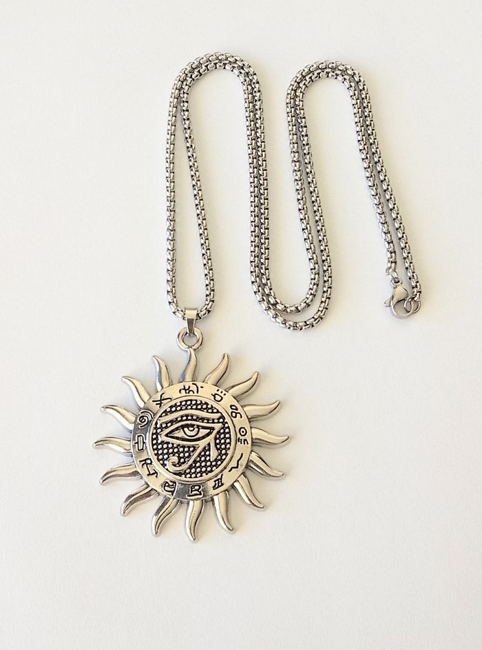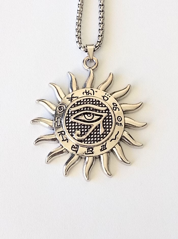 Chaîne + pendentif égyptien. Pendentif : soleil, motif : oeil d’horus. (égyptien, antique, celtique, spirituel, idéal cadeau) DESCRIPTIF : Couleur : argenté, noir. Taille chaîne : 60 cm Diamètre pendentif : 4,5 cm L * 5 cm H Envoi rapide et soigné.