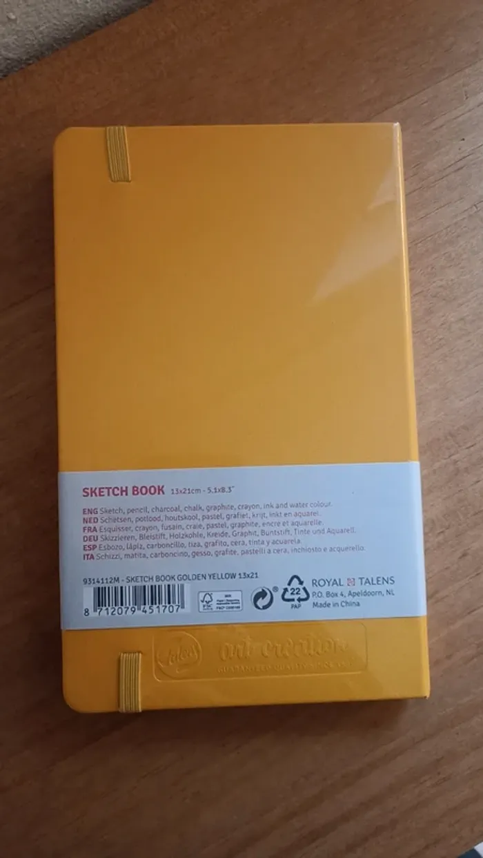 Vend ce Carnet de croquis 13 x 21 cm Pointillés - ArtCreation NEUF, couleur jaune d'or. Carnet de croquis, dessin, ou esquisse. Le grammage du papier de 140 g/m² convient pour les techniques sèches, le feutre, ou le dessin à l’encre. La couverture rigide en simili cuir, et le papier sans acide en font un carnet durable. Fermeture du carnet avec bande élastique.