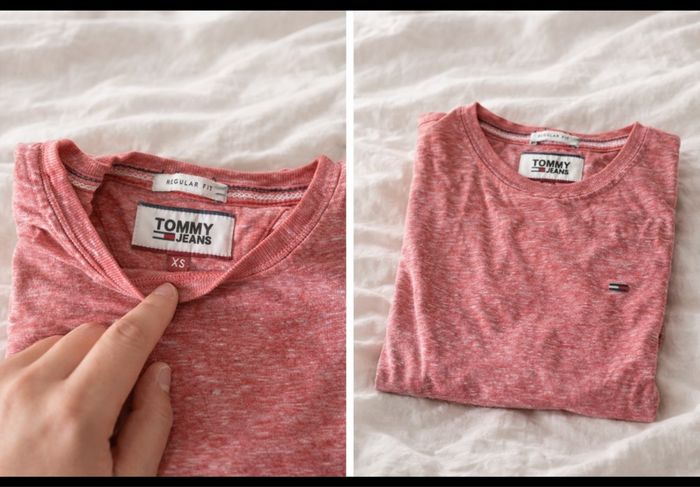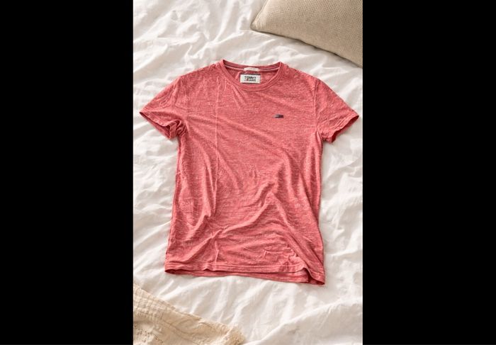 T-shirt tommy jeans rose chiné Taille XS en très bon état Aucun défaut Acheter au rayon homme en taille XS mais correspond a un S/M dans les coupe femme. Matière agréable, légère et confortable à porter. Coupe droite classique, facile à assortir avec un jeans, short ou joggings. Peut porté. Idéal pour un look casual et tendance.