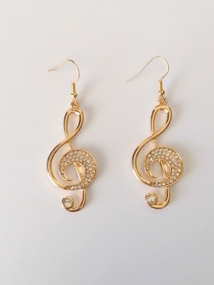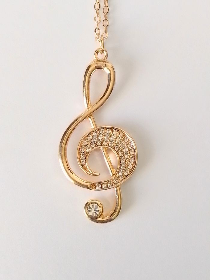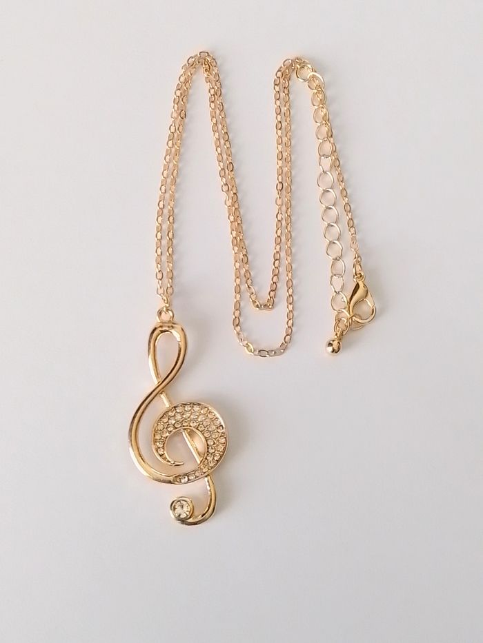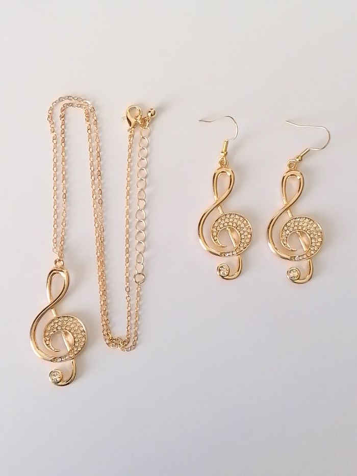 Parure élégante. Parure : chaîne, pendentif + boucles d'oreilles, note de musique, strass. (élégant, bohème, musique, idéal cadeau) DESCRIPTIF : Couleur : doré Taille chaîne : 45 cm + 5 cm Diamètre pendentif : 2 cm L * 4,5 cm H Diamètre boucles d’oreilles : 2 cm L * 4,5 cm H Envoi rapide et soigné.