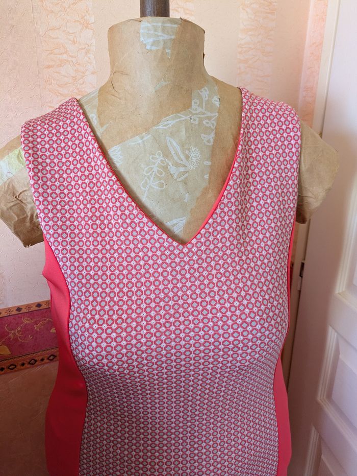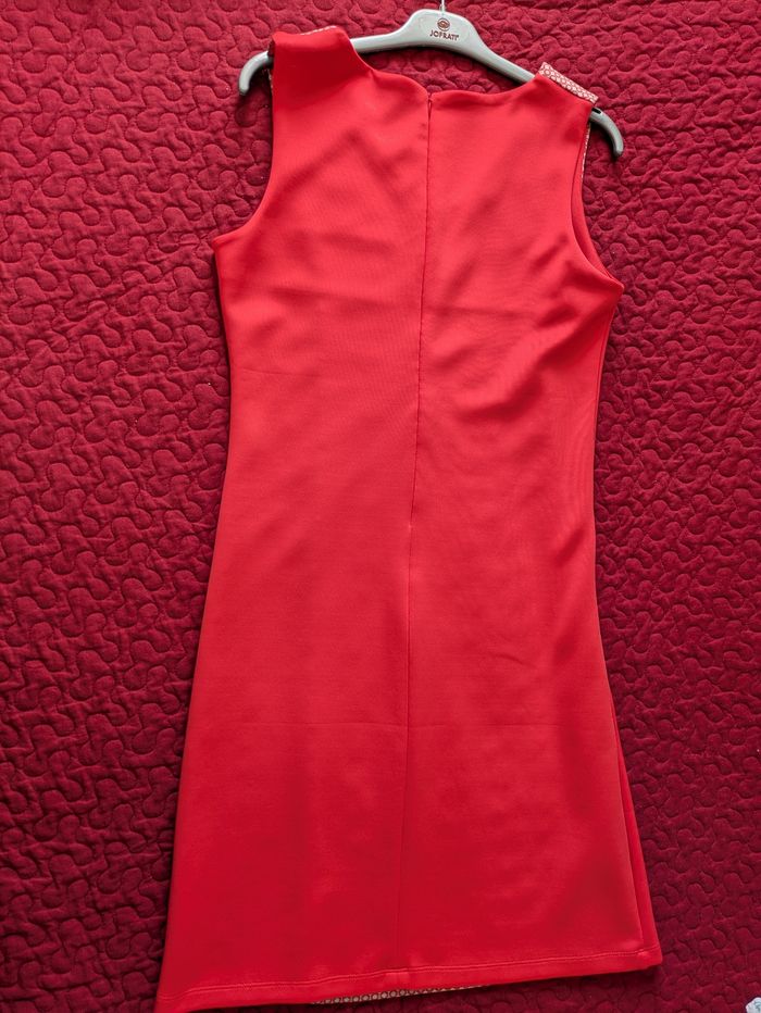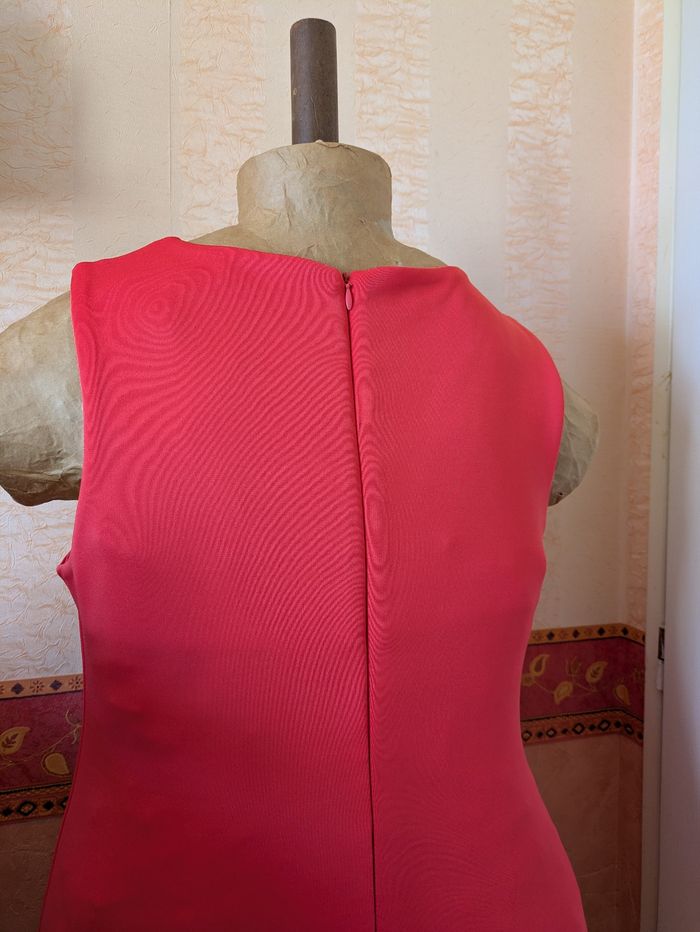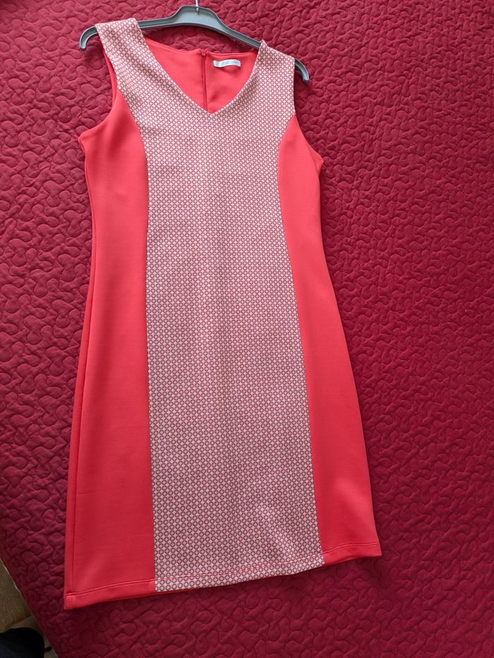 Robe ajustée en polyester, fermeture éclair au dos, couleur corail, motifs marron clair. Pas de défaut.