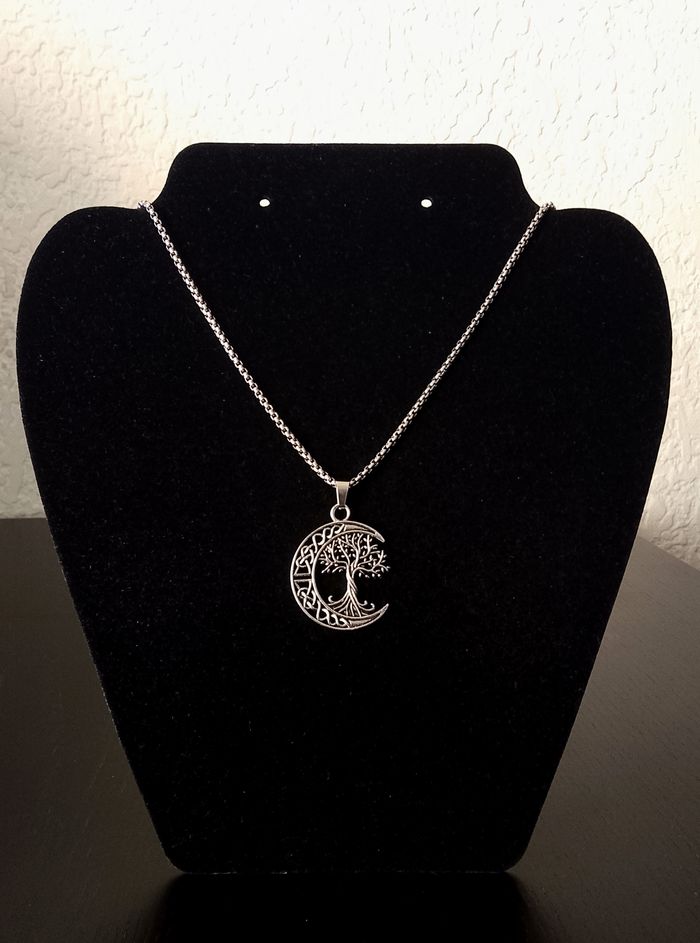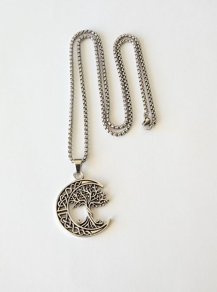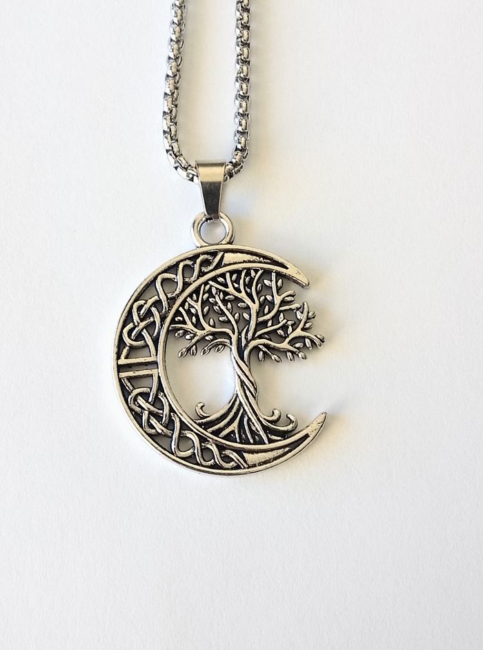 Chaîne + pendentif spirituel. Pendentif : croissant lune, arbre de vie. (spirituel, bohème, celtique, protection, idéal cadeau) DESCRIPTIF : Les deux faces sont identiques. Couleur : argenté. Taille chaîne : 60 cm Diamètre pendentif : 3 cm L * 3,5 cm H. Envoi rapide et soigné.