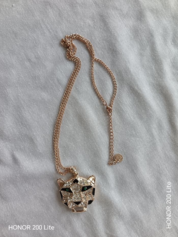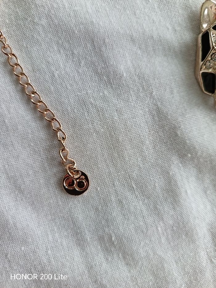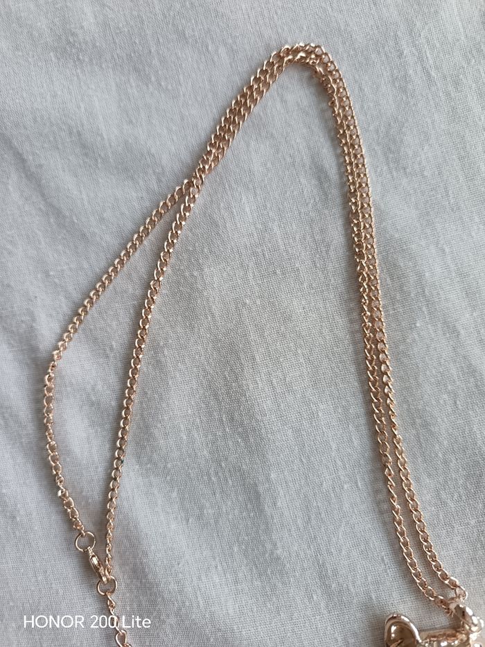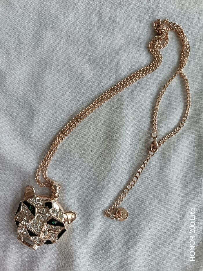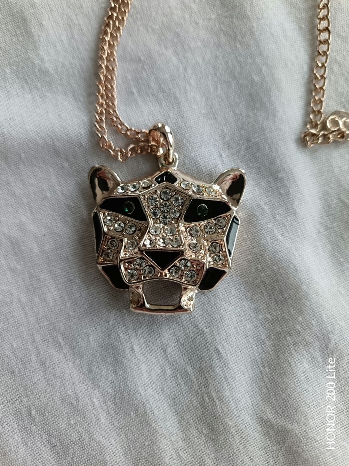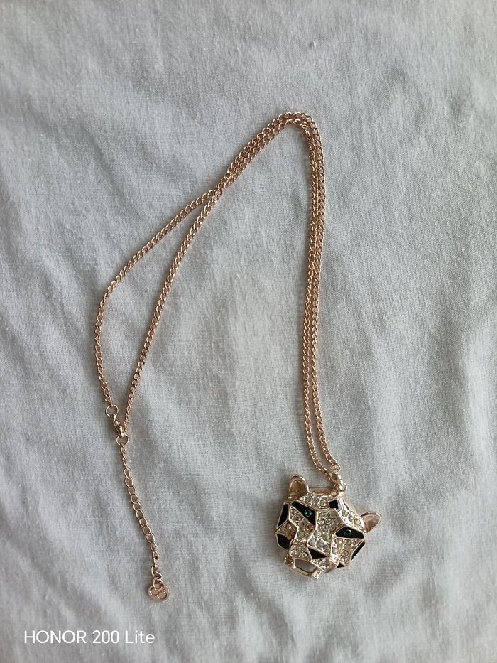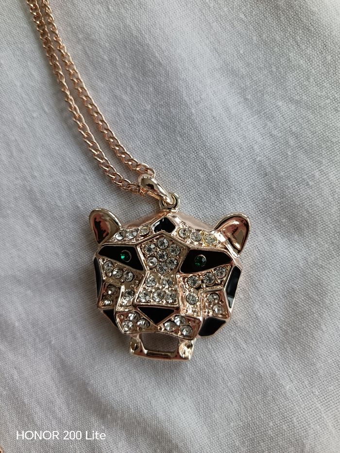 Panthère avec strass, strass vert au niveau des yeux Chaîne de couleur dorée Inscription OÔ sur niveau de la chaîne je pense que c'est la marque Oôra En bon état Prix négociable
