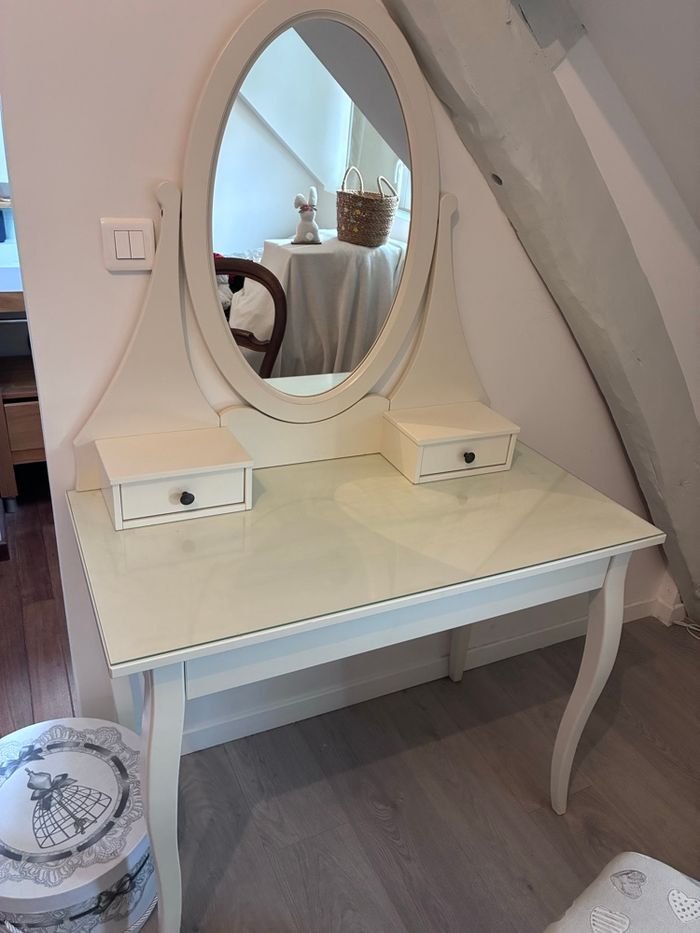 Je vends cette coiffeuse IKEA blanche en bois, avec son miroir ovale orientable. Parfaite pour ajouter une touche d'élégance à votre chambre ! - Type de produit : Coiffeuse - Marque : IKEA - Matériau : Bois - Couleur : Blanc - Miroir : Ovale orientable - Fonctionnalités : 3 tiroirs de rangement - Pièce : Chambre Très bon état N'hésitez pas à me contacter pour plus d'informations ou de photos :)