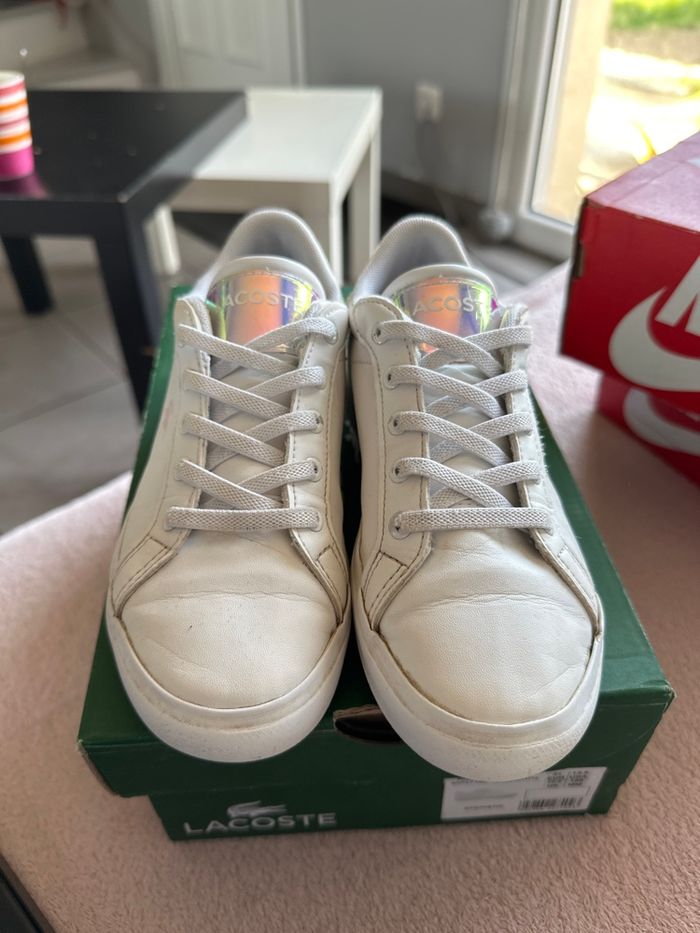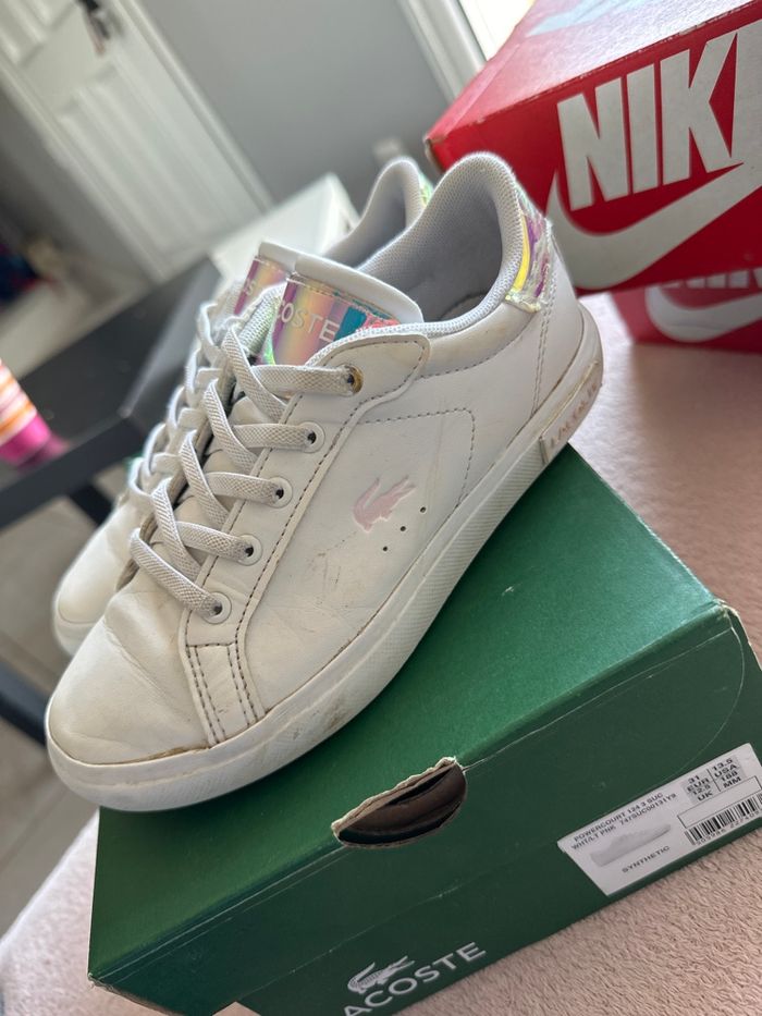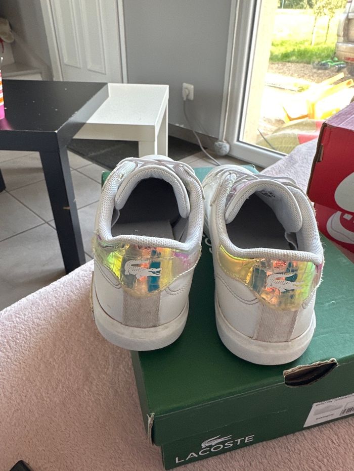 Bonjour je vend une paire de baskets Lacoste élastique fille taille 31 de couleur blanche en bonne état pour jouer encore dehors dans le jardin ou même pour le sport …
