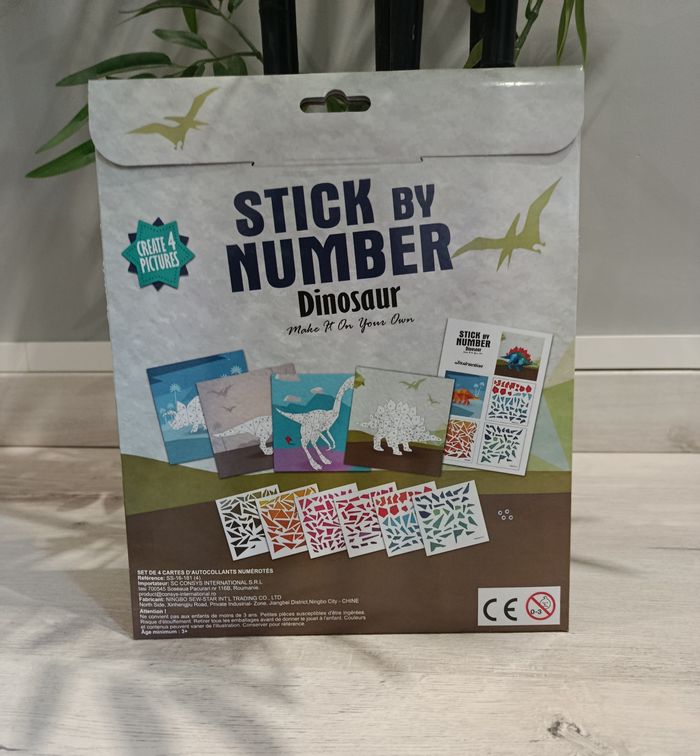 Mosaïque par numéro dinosaure. Set de 4 cartes d'autocollants. Ensemble d'autocollant à coller en suivant les numéros. Idéal pour occuper le temps des enfants et faire travailler leur concentration et leur patience. Neuf sous emballage