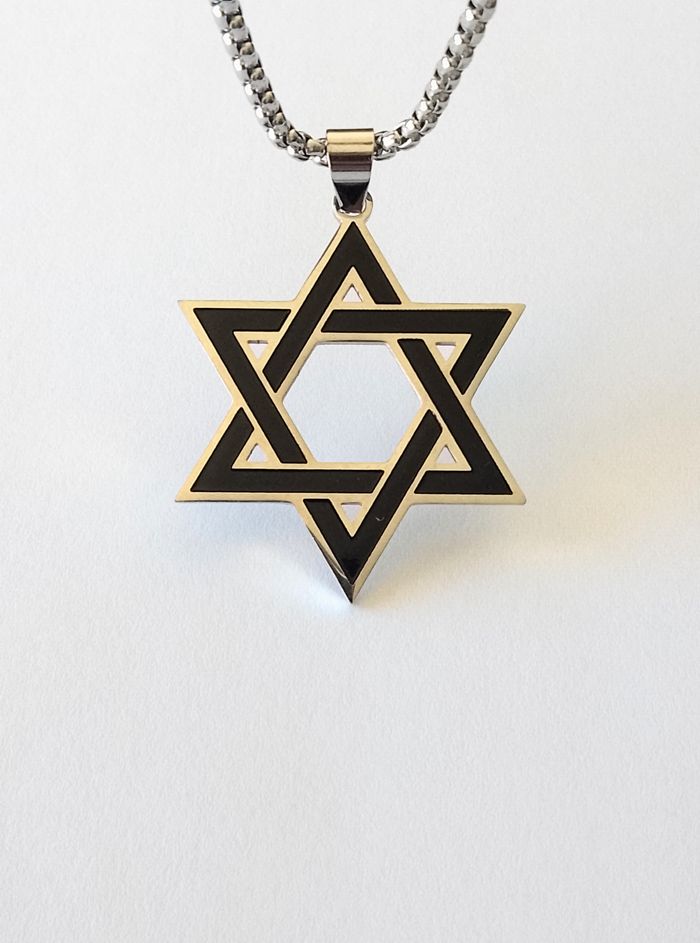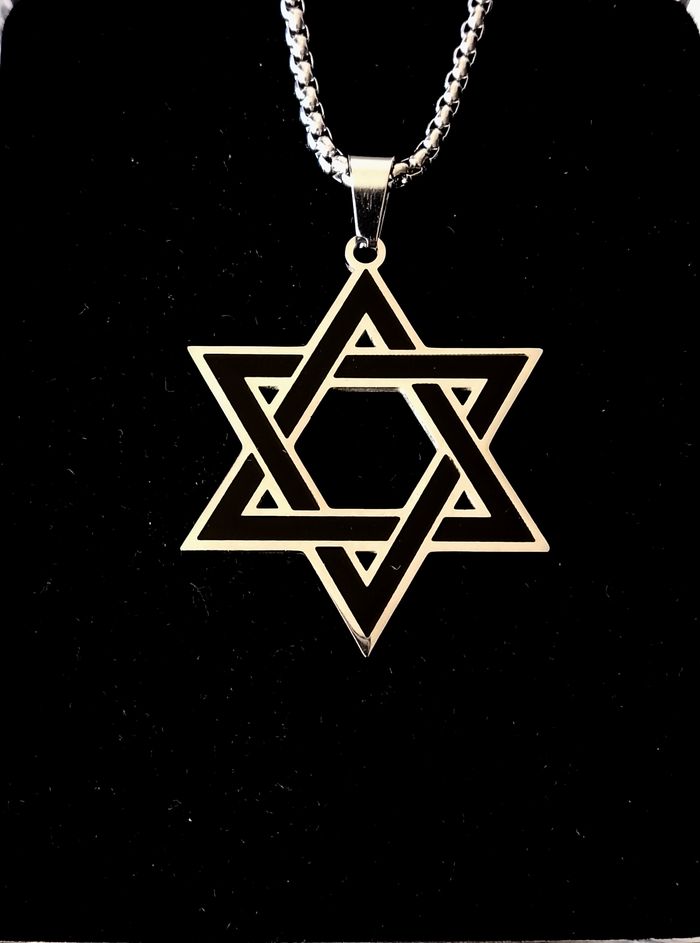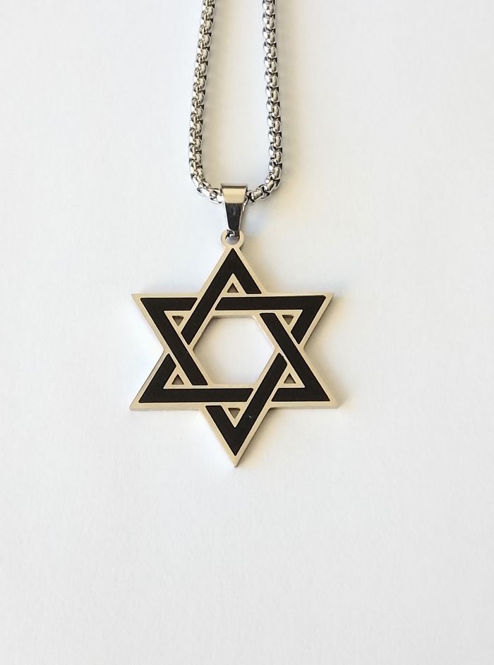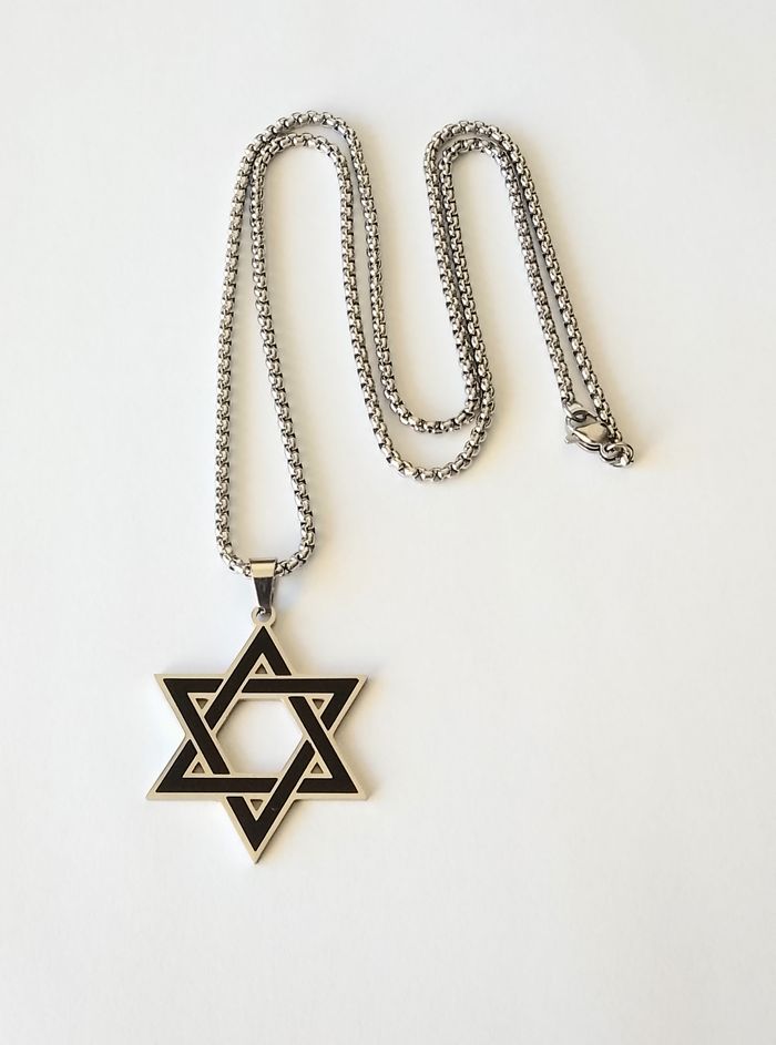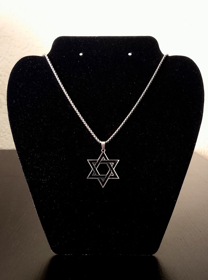 Chaîne + pendentif religieux. Pendentif : hexagramme. (religieux, protection, spirituel, celtique, idéal cadeau) DESCRIPTIF : Couleur : argenté, noir. Taille chaîne : 60 cm Diamètre pendentif : 3 L * 3,7 cm H Envoi rapide et soigné.