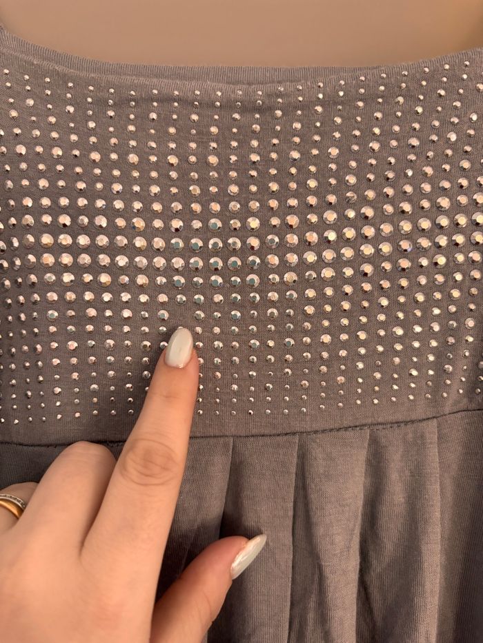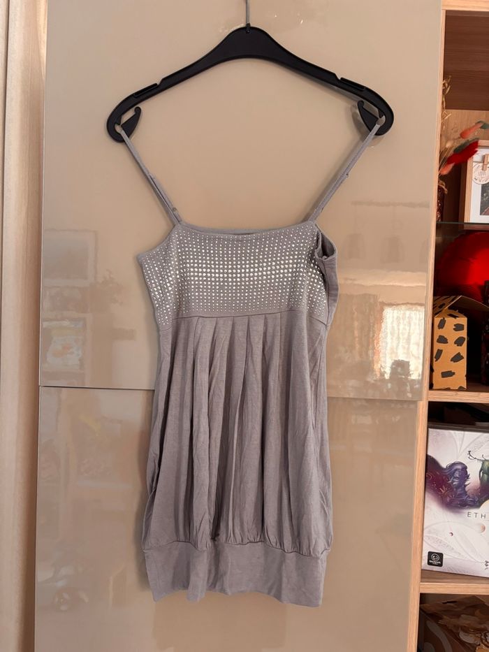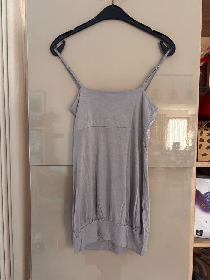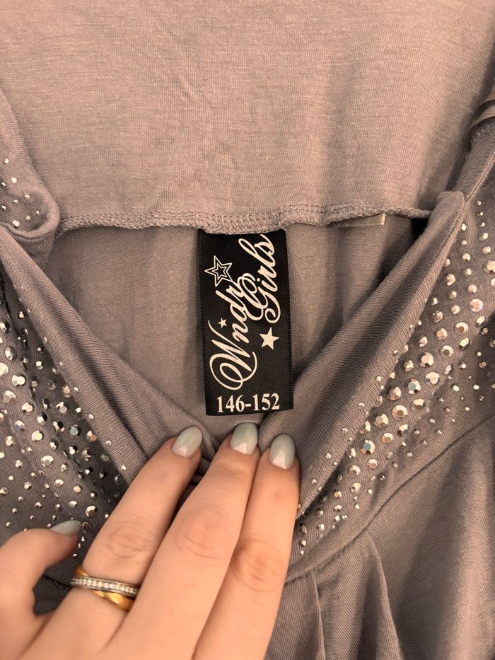 Débardeur gris avec strass sur le haut. Bretelles fines et réglables. Taille 146 - 152 En très bon état (sauf manque 1 strass voir photo).