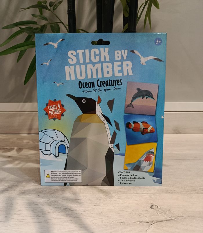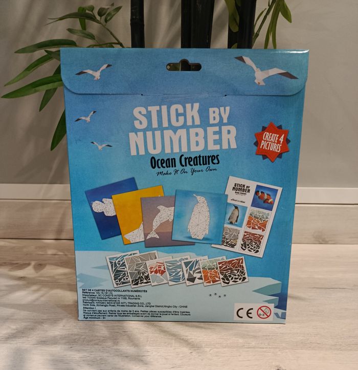 Mosaïque par numéro océan. Set de 4 cartes d'autocollants. Ensemble d'autocollant à coller en suivant les numéros. Idéal pour occuper le temps des enfants et faire travailler leur concentration et leur patience. Neuf sous emballage Ne convient pas aux enfants de moins de 3 ans.