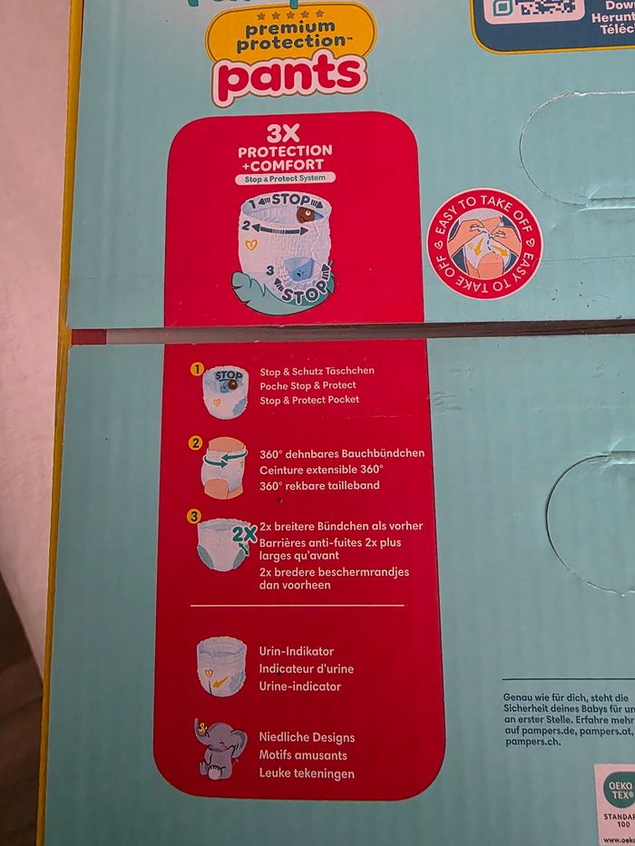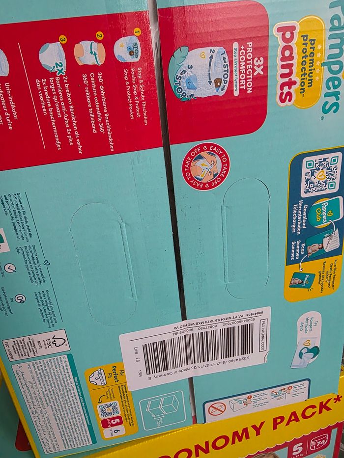 Je vends mon surplus de pampers pants taille 5, protection premium. 2 packs neufs jamais ouvert (soit 148 couches).