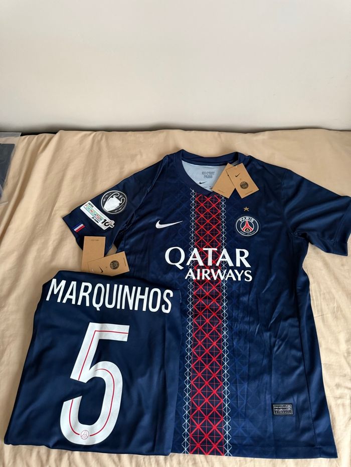Maillot PSG 2025/2026 Marquinhos Badge UEFA Taille S Maillot PSG 2025/2026 – Domicile ⭐ Flocage Marquinhos n°5 ⭐ Badge Ligue des Champions + UEFA Foundation 10 ans ⭐ Étoile LDC floquée 📦 Jamais porté, encore sous emballage 📌 Taille : S 📌 Saison : 2025/2026