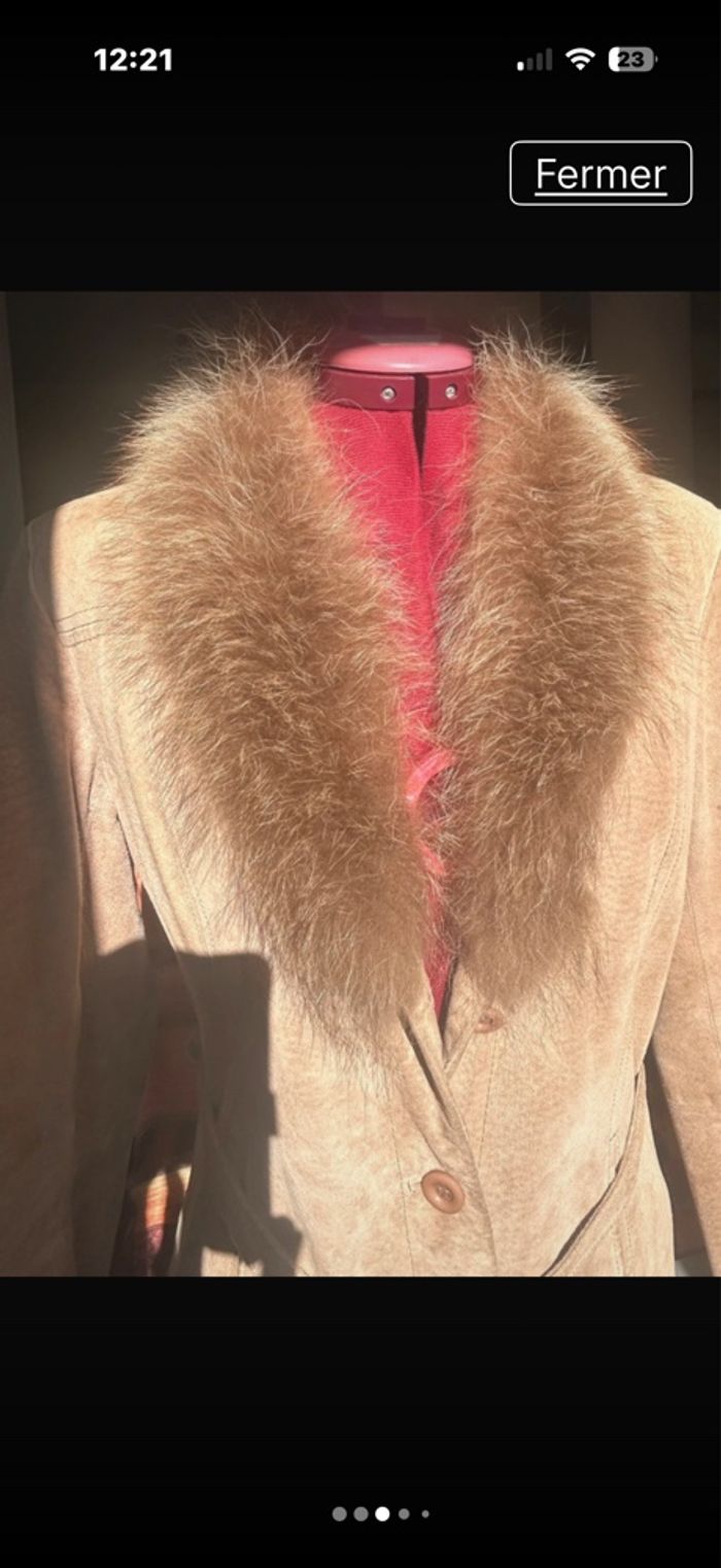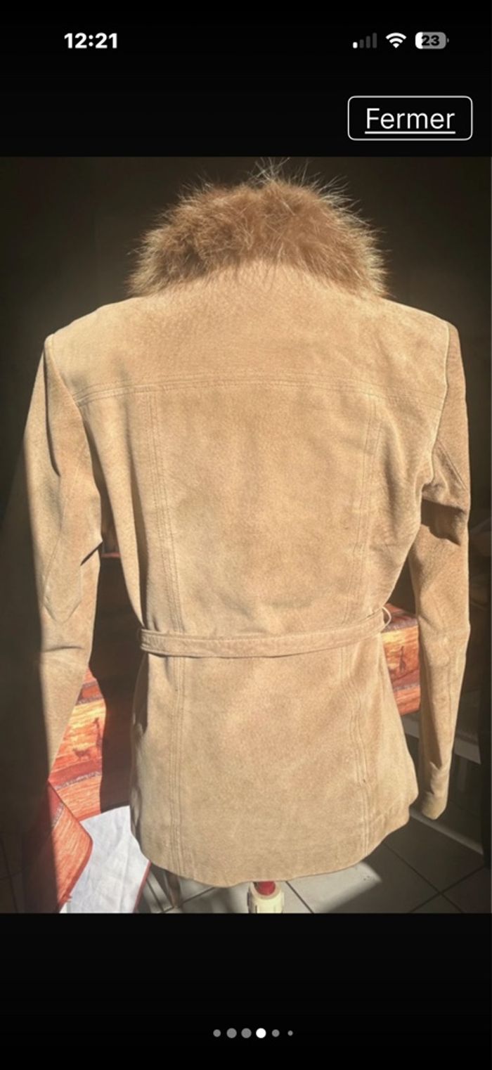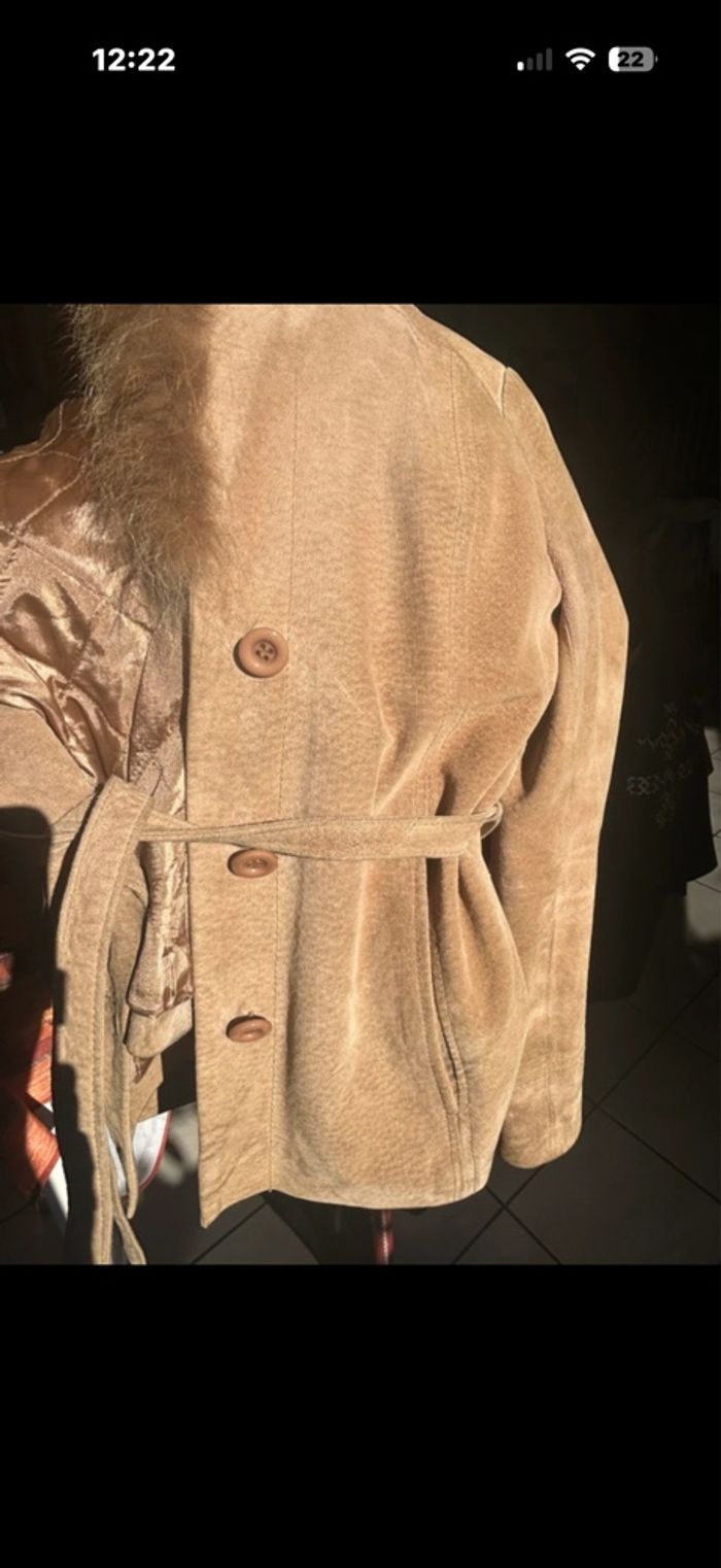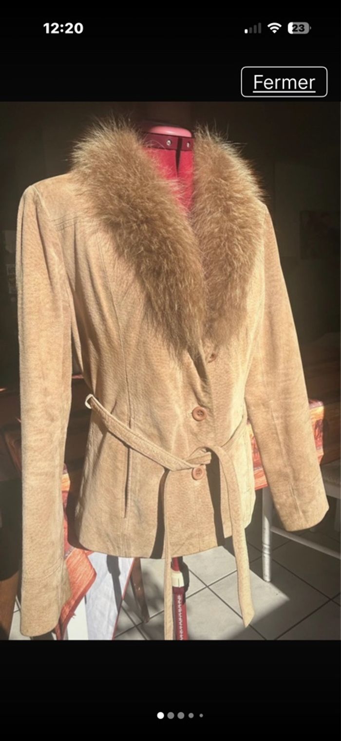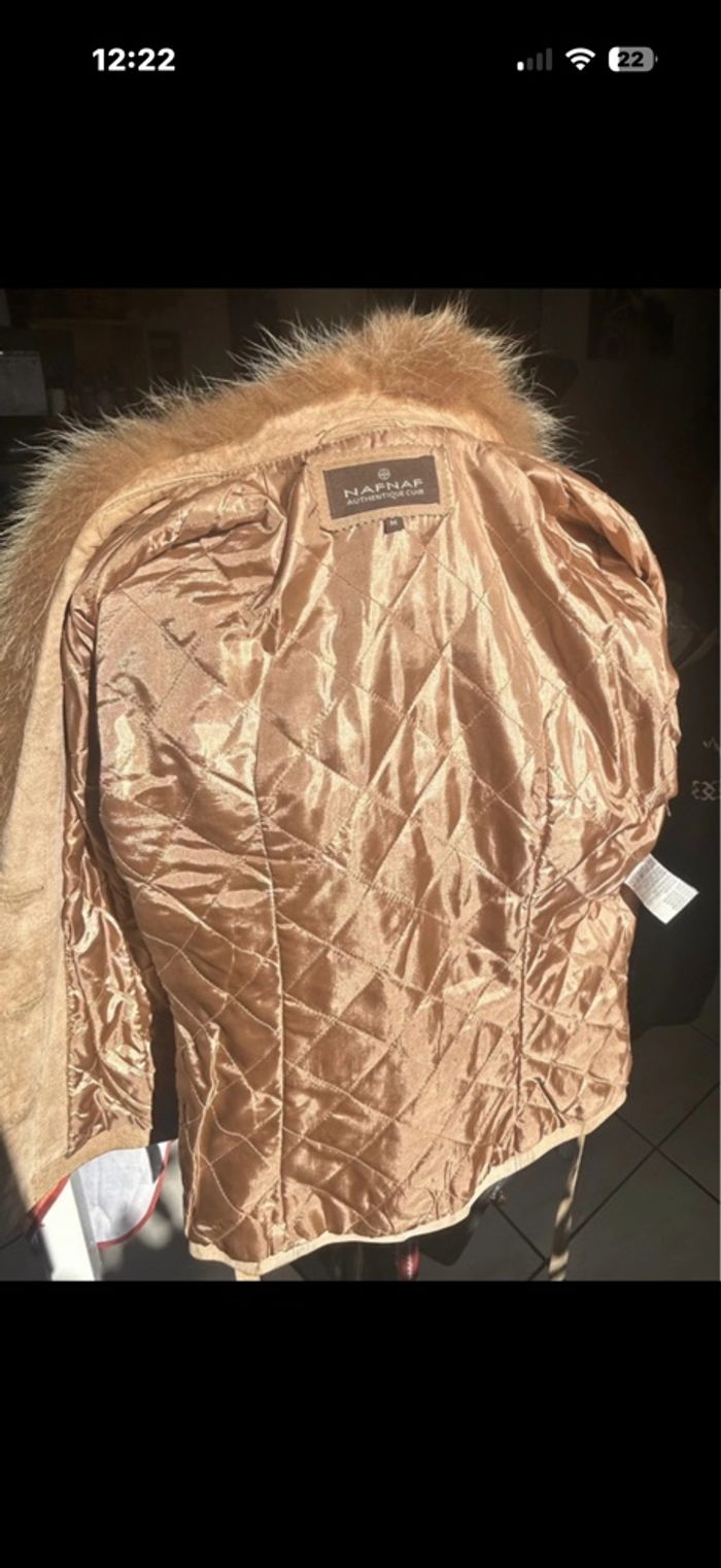 Veste Naf Naf beige en croûte de cuir véritable,, taille M , petites épaulettes , col fourrure véritable très douce , fermée par bouton et ceinture à la taille , 2 poches , doublure satin beige , très bon état .