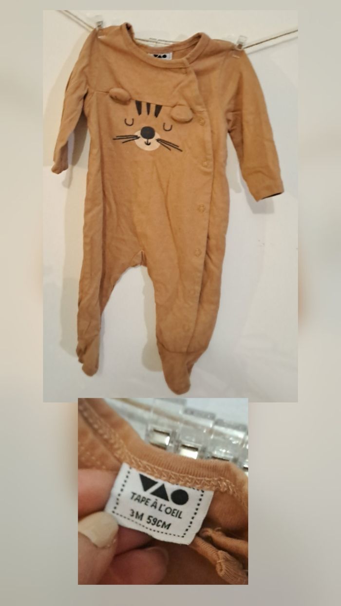 Vends lot de 2 dors-bien légèrs, de taille 3 mois, en excellent état, parfaits pour votre bébé. - 1 pyjama de marque ​Petit Bateau : Bleu avec motif poisson, ouverture pressionnée au dos. - 1 ​Tape à l'œil (TAO) : marron avec tête de tigre et petites oreilles en relief, ouverture pressionnée devant et à l'entrejambe. ​Maison non-fumeur. Lavés avec soin.