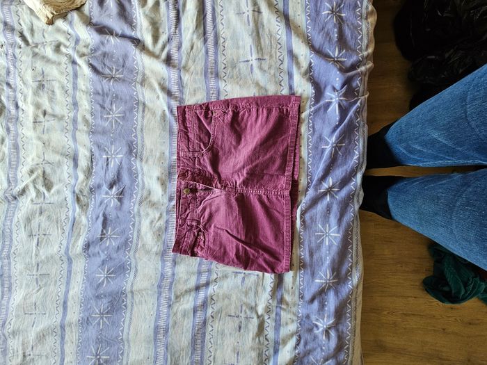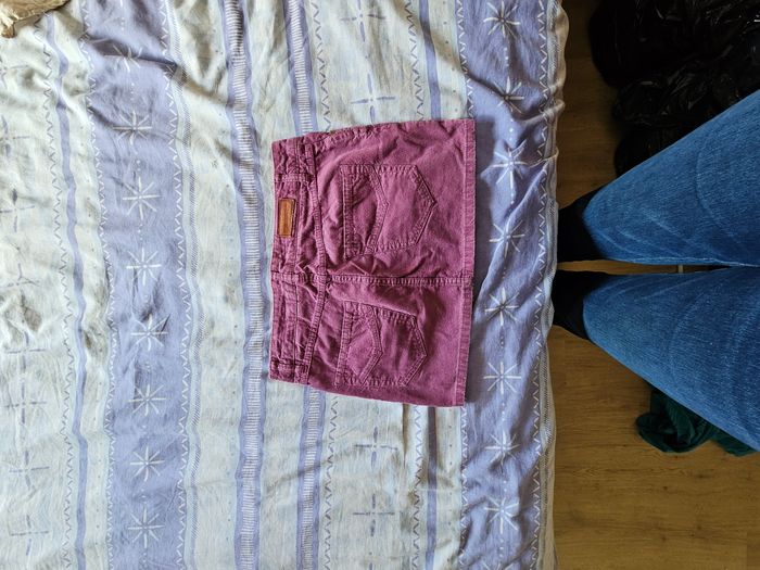 Jupe violette sur le devant 2 grandes poches et une petite , fermeture éclair. Derriére 2 grandes poches