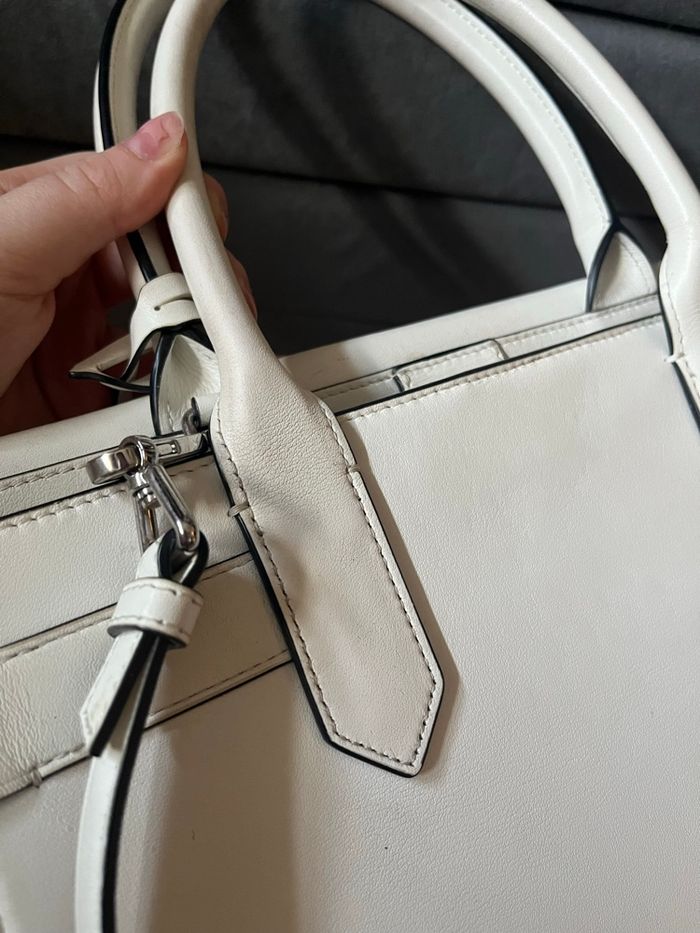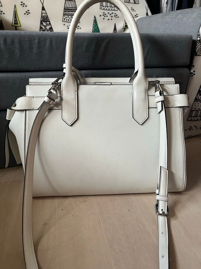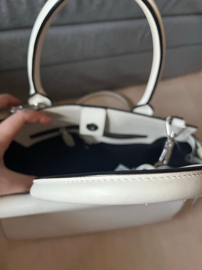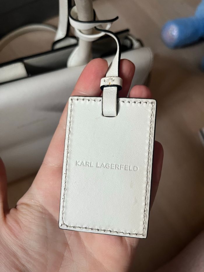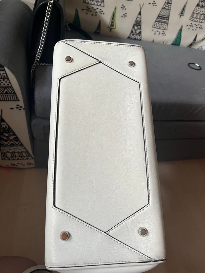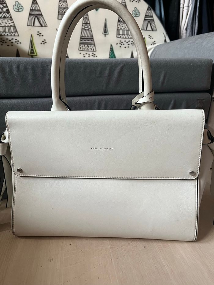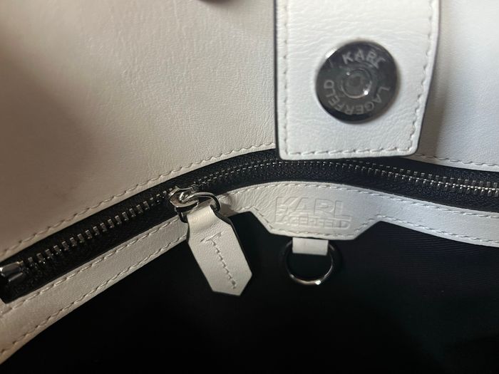 Sac cabas Karl Lagerfeld blanc Se faire avec une pression Pochette à rabat sur le devant et poche avec zip à l'intérieur Attention il présente des défauts d'usures (cf photos) comme des légères griffes vers le dessous, de l'usure sur les anses (intérieur qui ne se voit que de près) et couleur qui s'estompe à l'arrière Svp bien regarder les photos et si besoin je peux en faire d'autres
